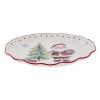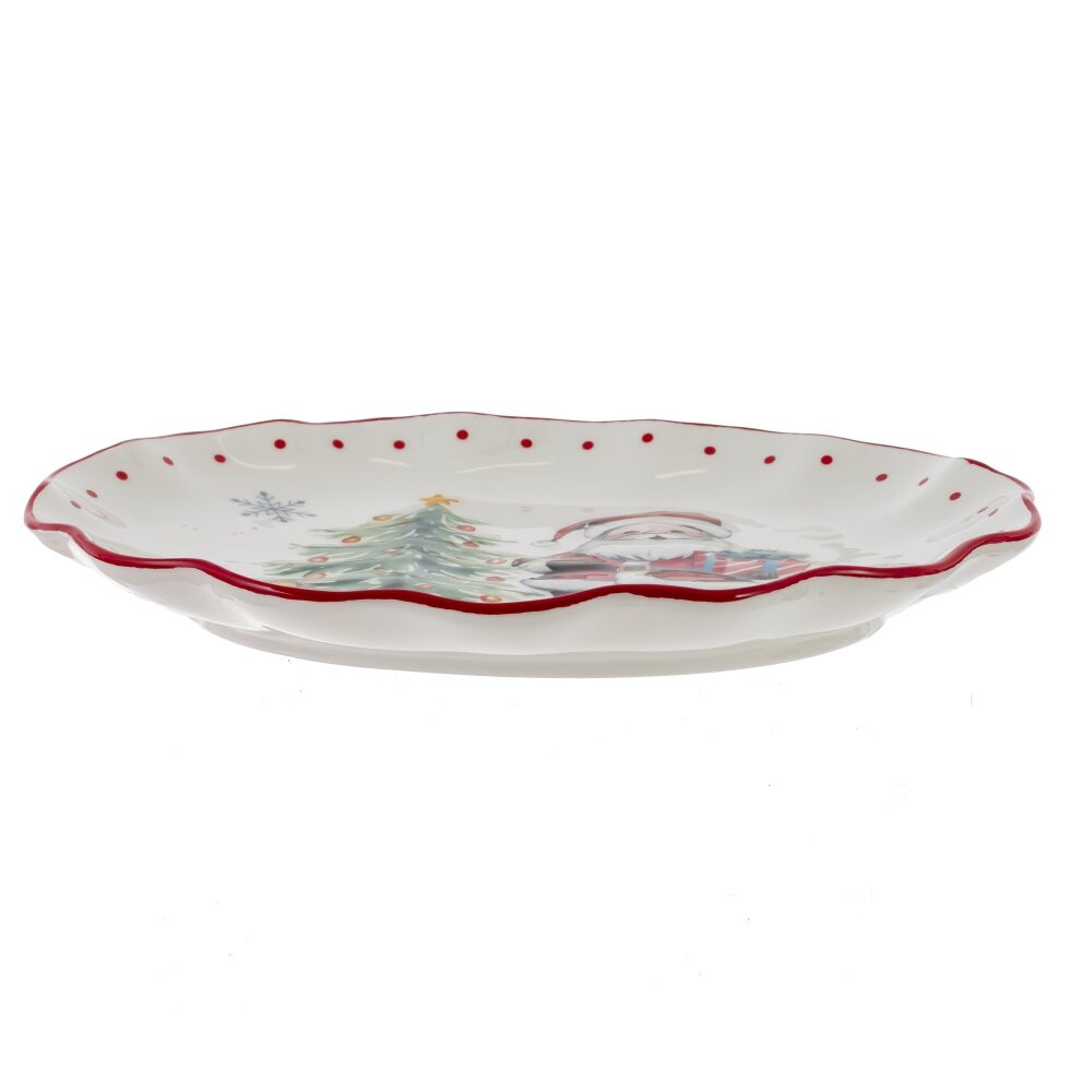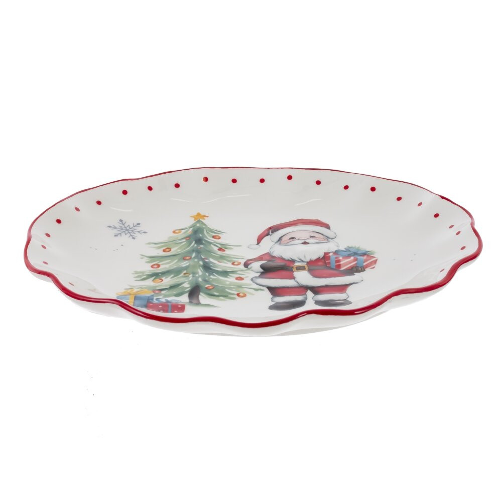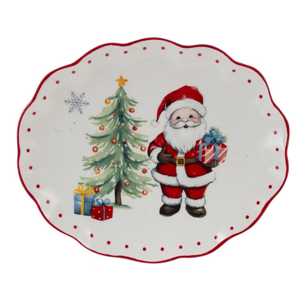 Блюдо из “Новогодний подарок” овальной формы с слегка волнистыми краями - очаровательный элемент новогоднего декора! В центре блюда рельефное изображение Санты с подарками у елочки. Красная кайма с точками добавляет блюду праздничный вид. Идеально подходит для сервировки новогодних угощений. Продукция сертифицирована, безопасна для контакта с пищевыми продуктами.