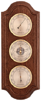 Механическая домашняя метеостанция с тремя циферблатами, включающая в себя барометр (прибор для измерения атмосферного давления), термометр (прибор для измерения температуры) и гигрометр (прибор для измерения влажности воздуха).