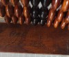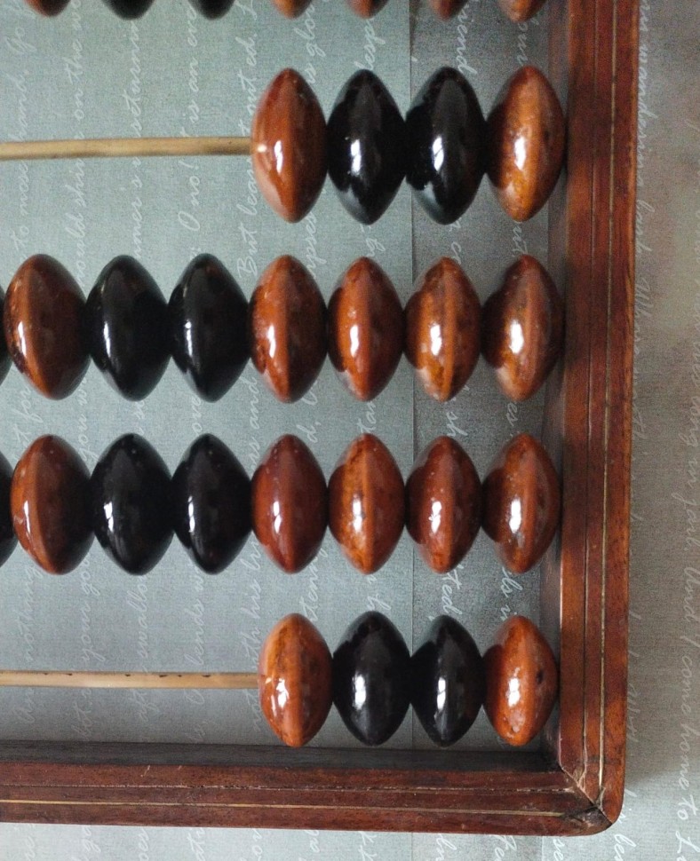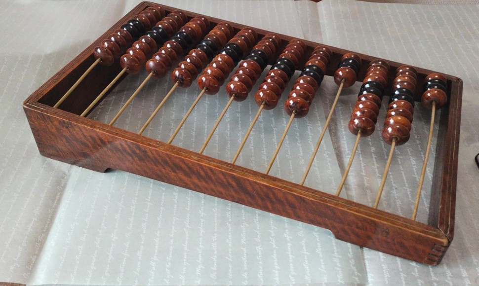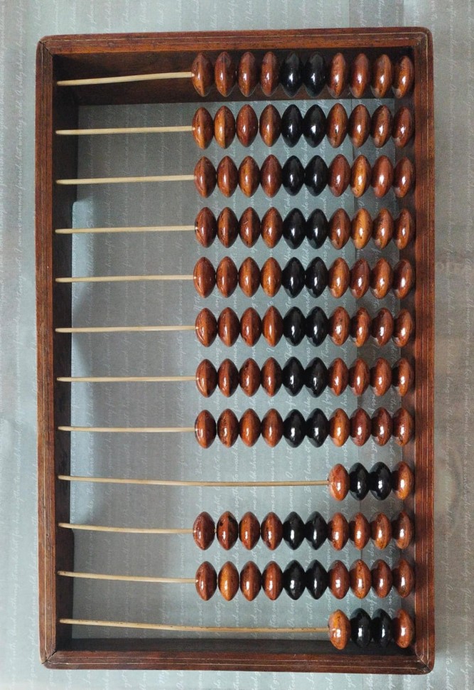 Деревянные товарные счеты среднего размера с двенадцатью спицами. От конторских «современных» наиболее известных счет они отличаются наличием не одного, а двух неполных рядов с четырьмя костяшками, что связано с дореволюционными временами, когда копейка была не самой мелкой денежной единицей и делилась на «полушки» и «деньги» – четверть и половину копейки. Таким образом, нижний неполный ряд служил для счета полушек (4 полушки =2 деньги=копейка). Далее вверх шли две спицы с копейками – единицами и десятками. Затем, после второго неполного ряда, который являлся разделителем целых и дробных чисел, начинались рубли (единицы, десятки, сотни и т.д.) Считать таким образом можно было не только деньги, и тогда самый нижний ряд просто не использовался.