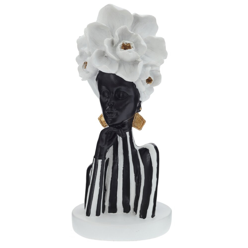 Декоративная фигурка «Африканка» — изящный акцент для современного интерьера. Бюст женщины выполнен из прочных полимерных материалов с плавной, тщательно прорисованной линией силуэта. Контраст черного корпуса и белых вертикальных полос подчеркивает утонченность образа, а крупный цветочный головной убор придаёт композиции выразительность и артистизм. Золотистые серьги добавляют теплый блеск и делают статуэтку заметным акцентом на полке, каминной полке или тумбе. Легкая, устойчивая и неприхотливая в уходе, эта фигурка станет стильным подарком и эффектным украшением гостиной, спальни или студии в этническом, минималистичном или арт-деко стиле.