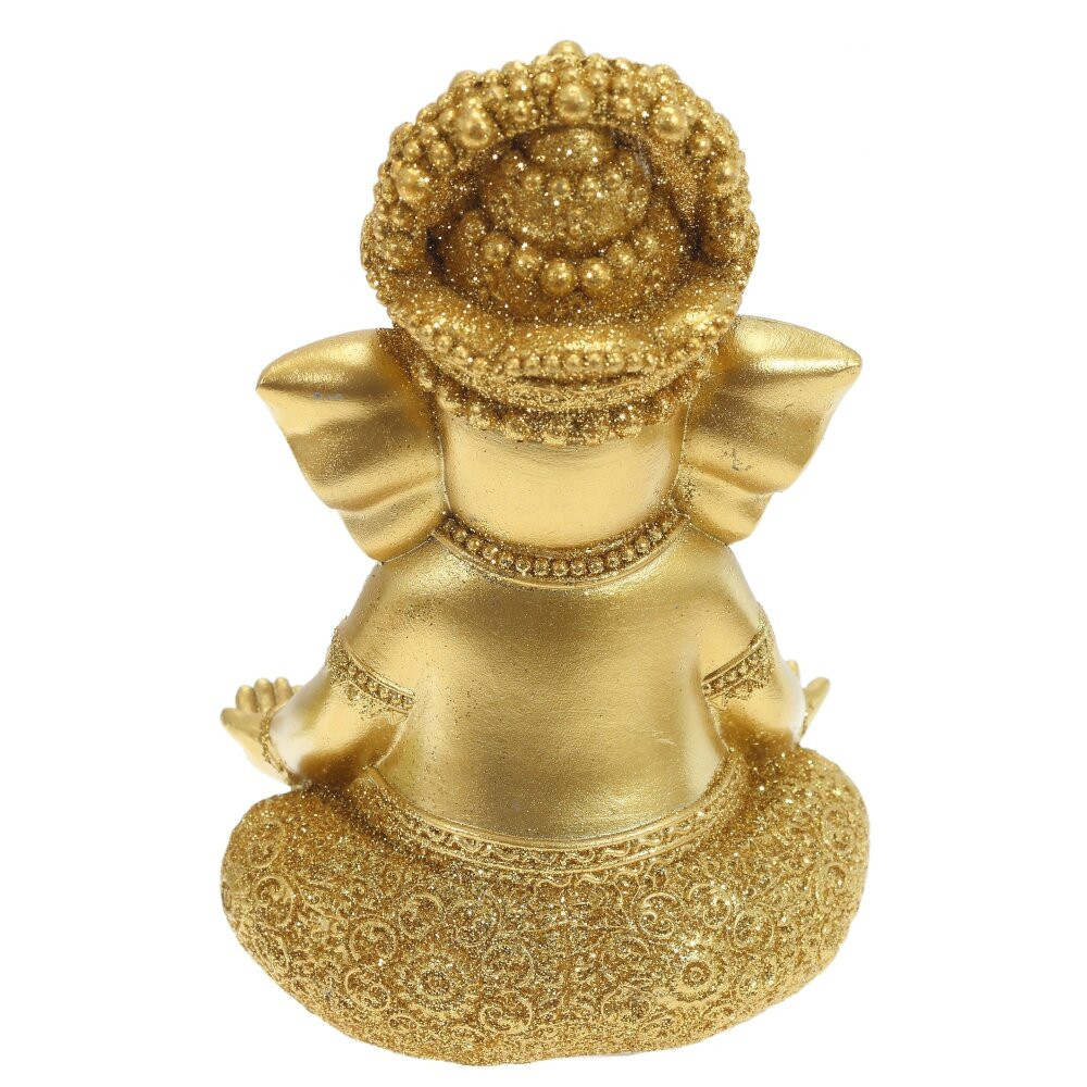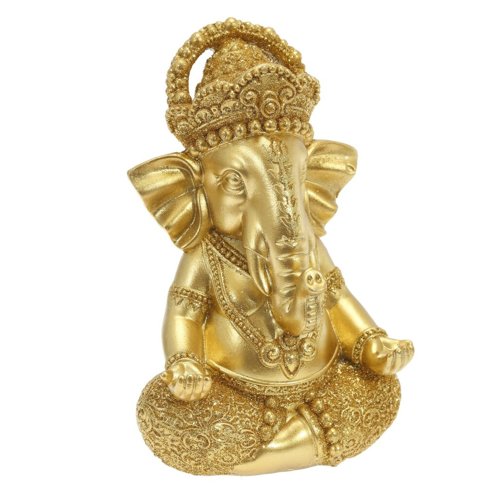 Декоративная фигурка, выполненная из полимерных материалов и покрытая золотого цвета. Она изображает Ганешу — знаменитое индуистское божество с головой слона, символизирующее мудрость, благополучие и удачу. Яркая позолота придаёт изделию изысканный и благородный вид, делая его эффектным элементом интерьера. Фигурка детально проработана: можно рассмотреть сложные орнаменты на одежде, украшениях и головном уборе. Благодаря прочному полимеру, украшение имеет долгий срок службы, не боится влаги и механических повреждений. Такая статуэтка станет прекрасным подарком или стильным украшением для дома, напоминая о гармонии, процветании и счастье.