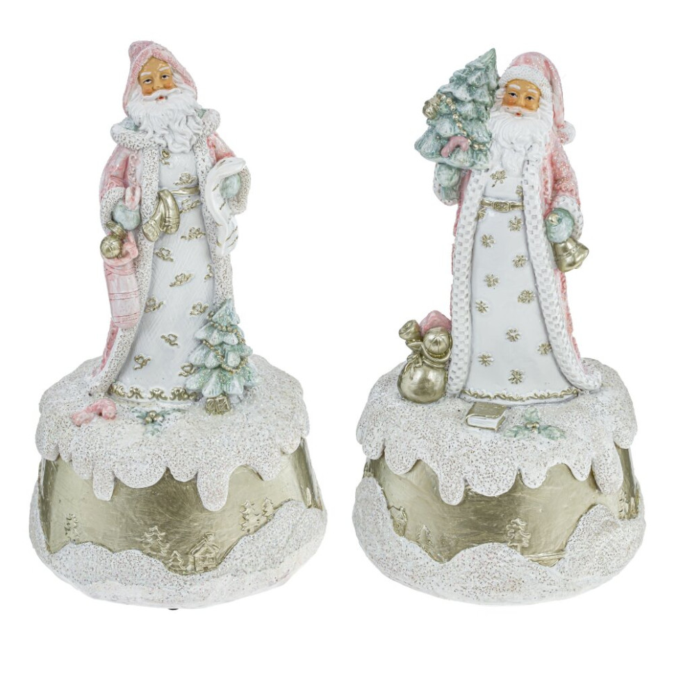 Декоративная фигурка "Дед Мороз" с музыкальным механизмом изготовленна из качественного полистоуна и выполнена в стильной розово-золотой цветовой гамме, что придает ей особый шарм и элегантность. Представлена в двух вариантах.