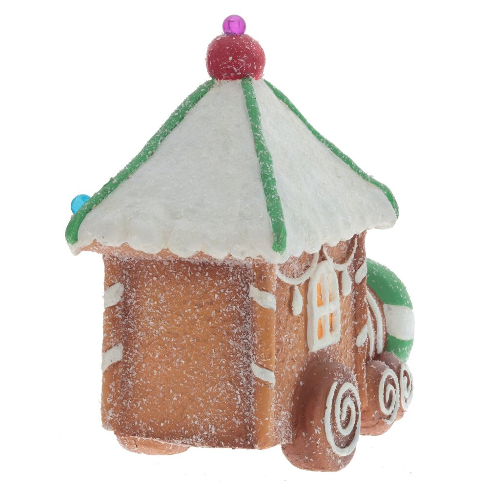 Декоративный "Паровозик" с подсветкой изготовлен из специальной керамики с магниевым оксидом и представляет собой пряничный локомотив с белой и зеленой "сахарной" глазурью. Когда включается подсветка, цветные лампочки на крыше и трубе начинают светиться. Изделие украшено снежным глиттером, создавая атмосферу праздника. Для работы подсветки необходимы три батарейки типа ААА (не прилагаются).