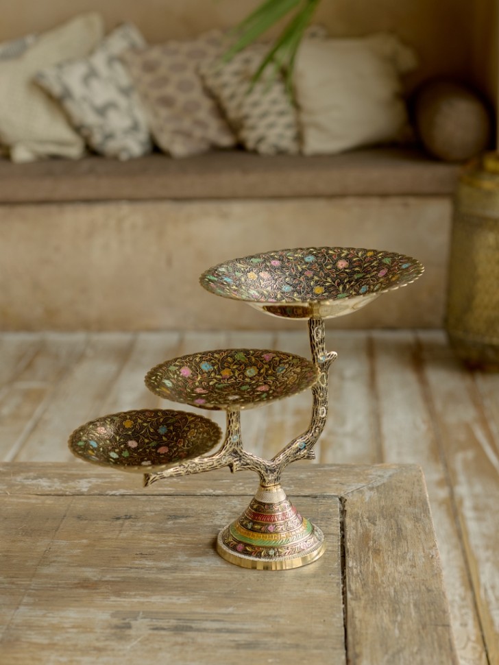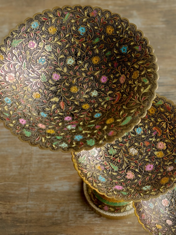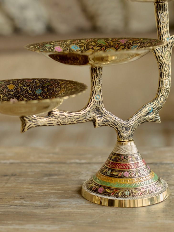 Изделие из латуни с традиционной индийской резьбой. Тёмная эмаль создаёт глубокий контраст с латунным узором. Украсит гостиную, кабинет или каминную полку.