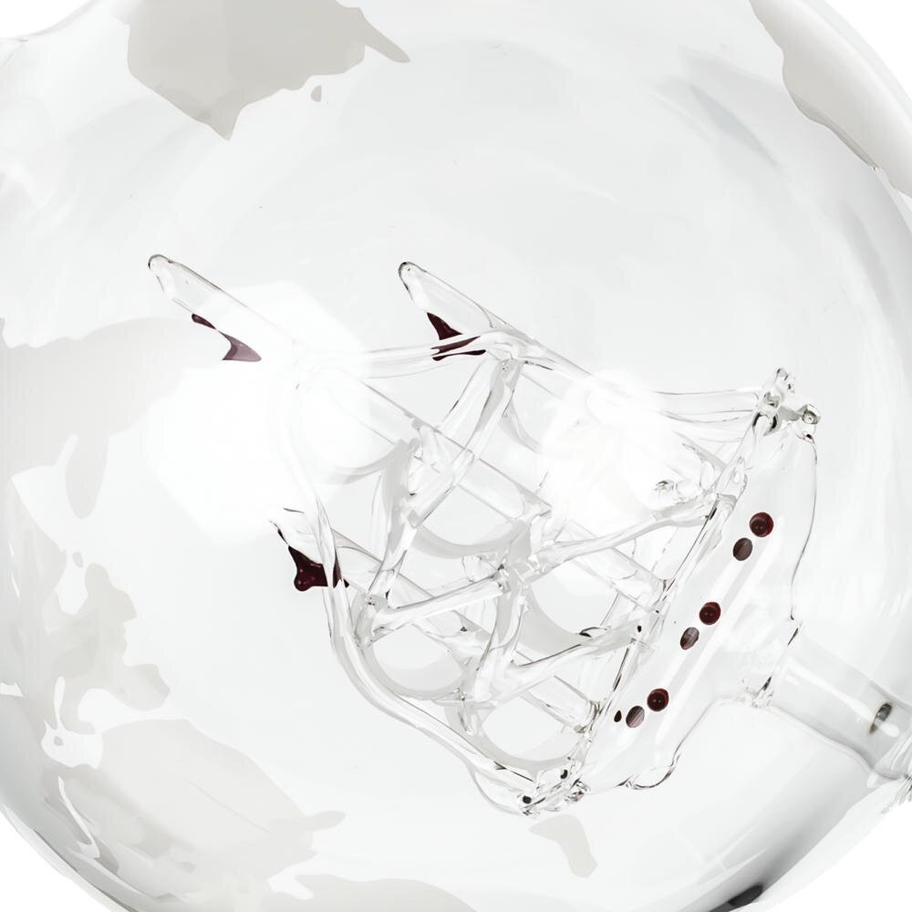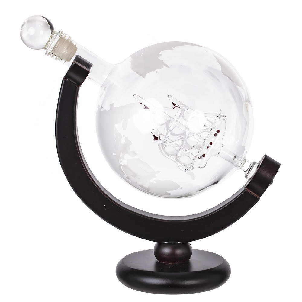 Графин «Глобус» на изящной деревянной подставке объединяет функциональность и эстетику путешествий. Сферическая колба из прозрачного стекла украшена матовыми очертаниями материков, а внутри расположен миниатюрный стеклянный парусник, создающий эффект глубины. Горлышко закрывается шарообразной стеклянной пробкой с уплотнителем, что помогает сохранить аромат и вкус напитка. Объем 950 мл рассчитан на стандартную бутылку виски, вина, коньяка или домашних настоек. Темное дерево подставки подчеркивает блеск стекла и обеспечивает устойчивость. Такой графин станет эффектным центром сервировки в гостиной, кабинете или баре и запоминающимся подарком тем, кто ценит стильные детали интерьера и атмосферу далеких странствий.