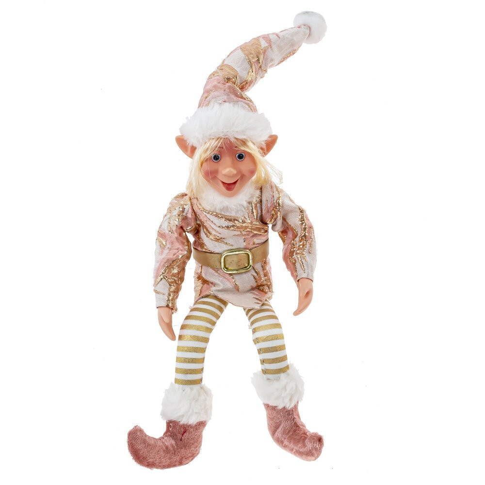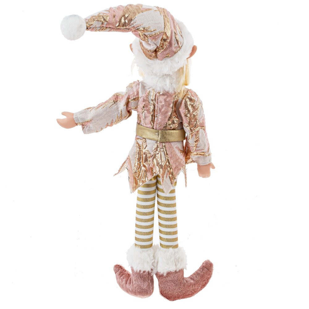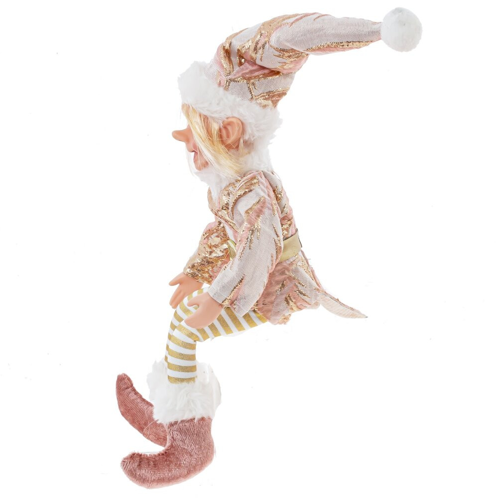 Веселый декоративный Эльф в праздничном блестящем розовом костюме и колпаке заряжает радостью. Он имеет реалистичные лицо и кисти рук из полимерных материалов. Уникальность игрушки заключается в том, что благодаря проволоке внутри рук и ног можно создавать различные позы, что добавляет игривости образу.