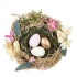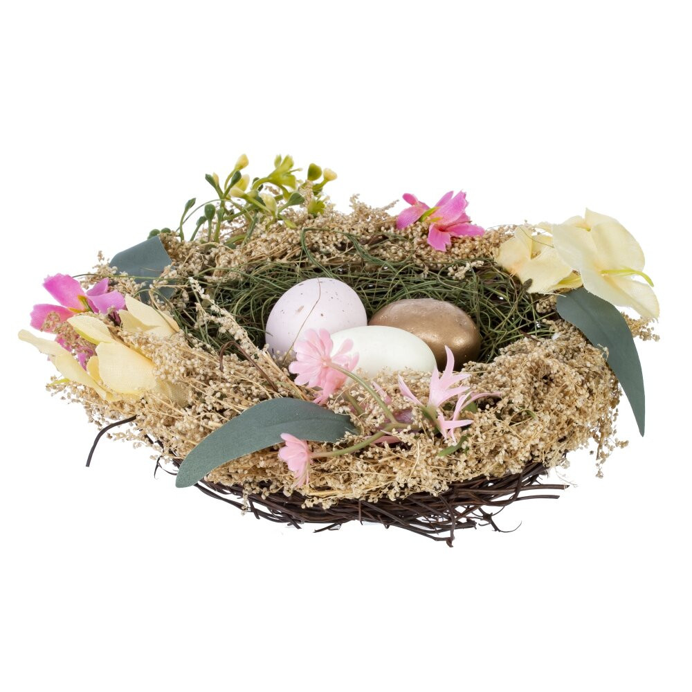 Декоративное изделие «Гнездо пасхальное» — изящный акцент для весеннего украшения дома, праздничного стола или витрины. Основа выполнена из натуральных материалов, имитирующих сухую траву и прутья, внутри расположено мягкое зелёное «сено». В центре гнезда — три пасхальных яйца из полимерных материалов: белое, нежно?розовое с крапинками и эффектное золотистое. Композиция дополнена искусственными листочками и цветами пастельных оттенков, которые подчёркивают атмосферу обновления и уюта. Лёгкое и долговечное изделие не требует ухода и будет радовать вас не один сезон.