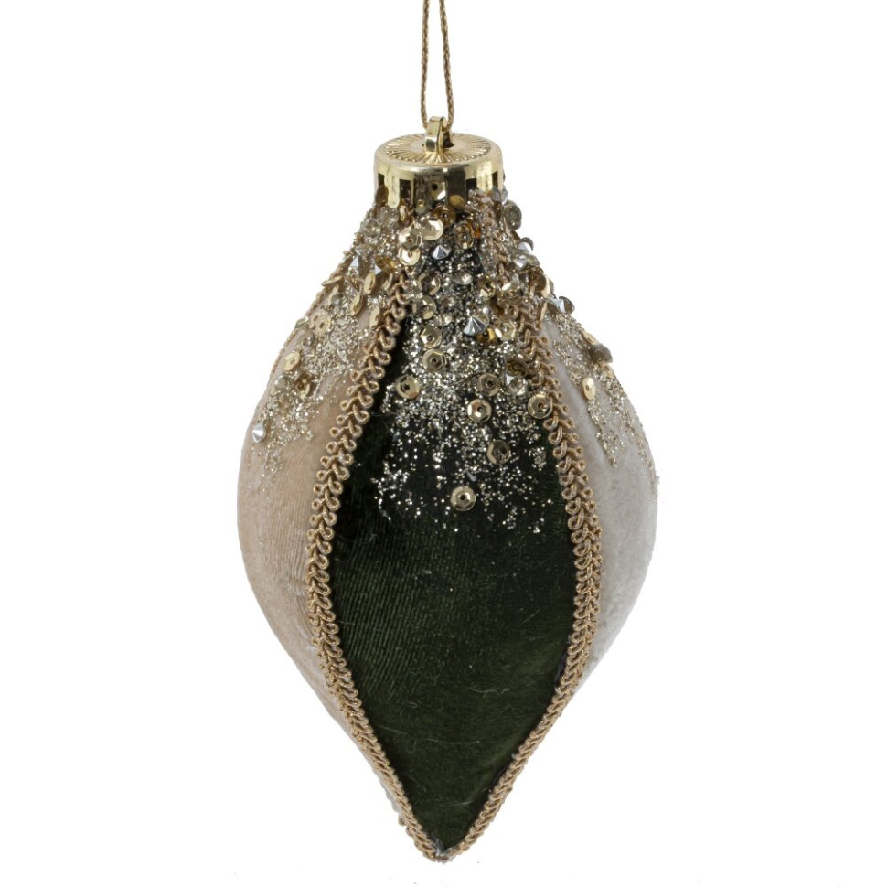 Декоративная подвеска "Капля" обладает изящным дизайном. Бархат в зеленых и бежевых оттенках, украшенный золотыми пайетками и тесьмой, придает изделию благородный вид. На верхушке подвески есть петелька для удобного подвешивания. Это изысканное украшение создаст уютную новогоднюю атмосферу в вашем доме.