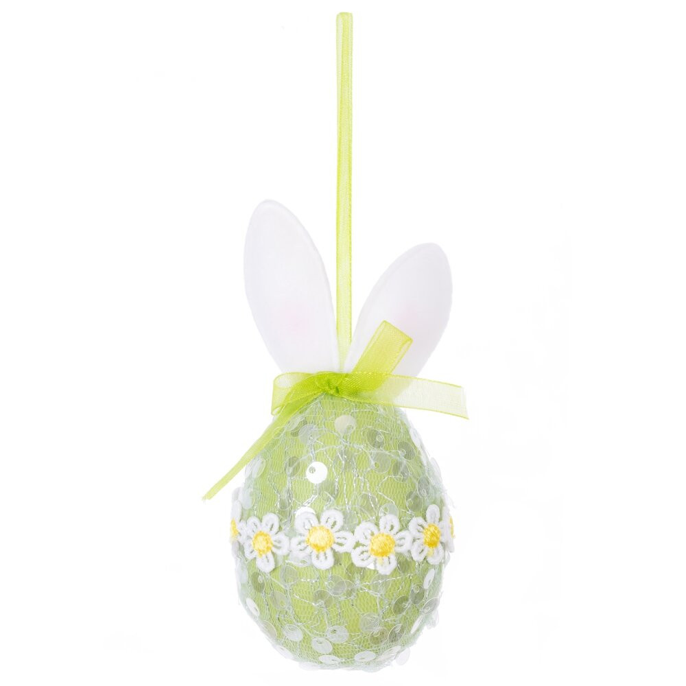 Подвесное декоративное изделие «Яйцо» – нежное пасхальное украшение для дома, офиса или праздничной витрины. Лёгкое яйцо из полимерного материала оформлено нарядным текстильным чехлом с кружевом, пайетками и цветочным декором по центру. Сверху композицию дополняют мягкие ушки и аккуратный бантик, создающие образ пасхального зайчика. Благодаря удобной подвесной петле украшение легко разместить на веточках вербы, пасхальном дереве, люстре или дверной ручке. Изделие долговечное, не бьётся, сохраняет яркий вид из года в год, поможет быстро создать атмосферу весеннего праздника и станет милым акцентом в любой композиции. Представлено в трех вариантах.