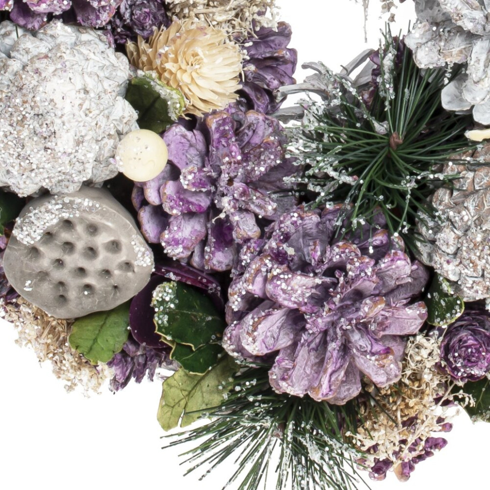 Новогодний декоративный венок с ярким декором из натуральных шишек, искусственных цветов и ягод будет уместен в любом интерьере, создавая уют и праздничное настроение.