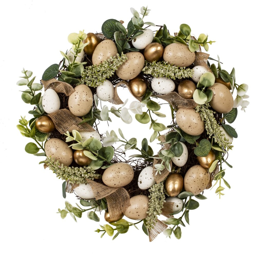 Этот элегантный пасхальный венок диаметром 32 см выполнен из сочетания натуральных и полимерных материалов, создавая атмосферу весеннего уюта. Основу композиции составляют декоративные яйца различных оттенков – от кремового до белого, с изысканным крапчатым узором, а также глянцевые золотистые акценты, придающие изделию праздничный блеск. Венок украшен искусственной зеленью, которая гармонично сочетается с фактурными элементами из мешковины, создавая эффект натуральности. Небольшие белые цветы и веточки с мелкими соцветиями добавляют свежести и легкости композиции. Натуральные ветки выступают основой венка, придавая ему прочность и традиционный стиль. Такой декор идеально подойдет для оформления дверей, стен или праздничного стола, привнося весеннее настроение и символизируя обновление и радость праздника.