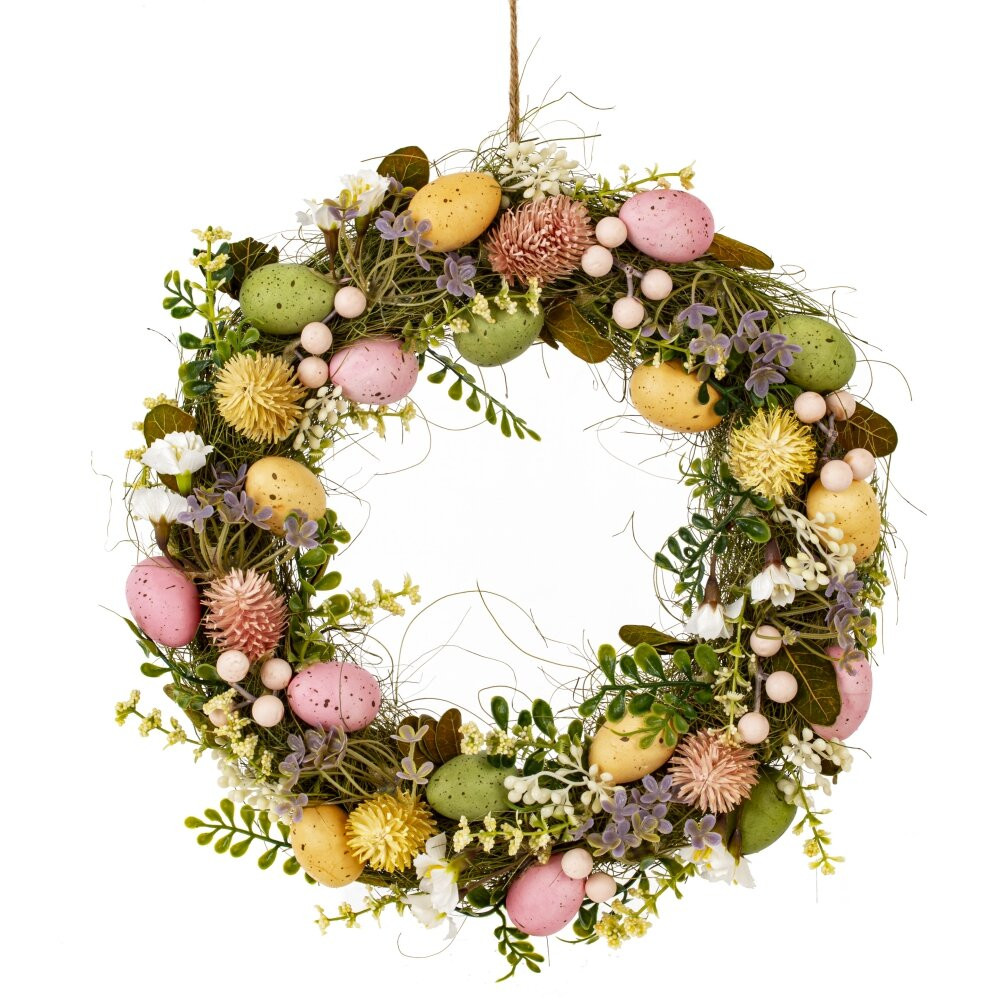 Этот великолепный пасхальный венок диаметром 32 см выполнен из сочетания полимерных и натуральных материалов. Он украшен искусственными яйцами в нежных пастельных оттенках – розовом, зелёном и жёлтом, имитирующими натуральные перепелиные яйца с характерными тёмными крапинками. Дополнительно венок декорирован изящными цветами, миниатюрными ягодами и разнообразной зеленью, включая мелкие листочки и травяные элементы, что придаёт ему естественный и праздничный вид. Композиция гармонично сочетает фактуры – сухоцветы, мягкие травяные волокна и плотные искусственные элементы, создавая богатую и объёмную текстуру. Венок выглядит нарядно, но при этом остаётся элегантным и утончённым, что делает его отличным украшением для двери, стены или праздничного стола. Благодаря использованию высококачественных материалов он будет радовать своей красотой долгое время. Этот венок станет идеальным дополнением к пасхальному декору, создавая атмосферу весеннего обновления и уюта в доме.