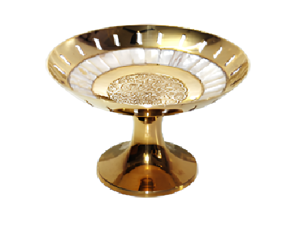 Конфетница из латуни для сервировки стола. Полированная поверхность подчёркивает тёплый золотистый оттенок латуни. Форма на ножке создаёт парящий эффект. Подойдёт для интерьера в восточном, этническом или бохо стиле.