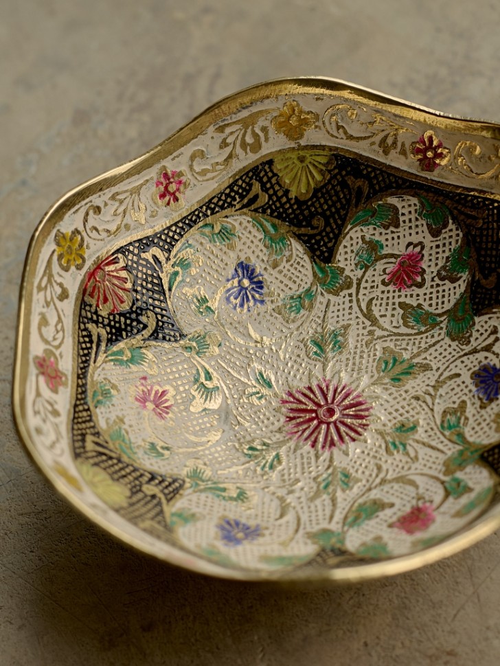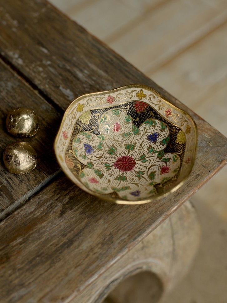 Латунная конфетница с традиционной индийской резьбой. Тёмная эмаль создаёт глубокий контраст с латунным узором. Станет акцентом в интерьере или оригинальным подарком.