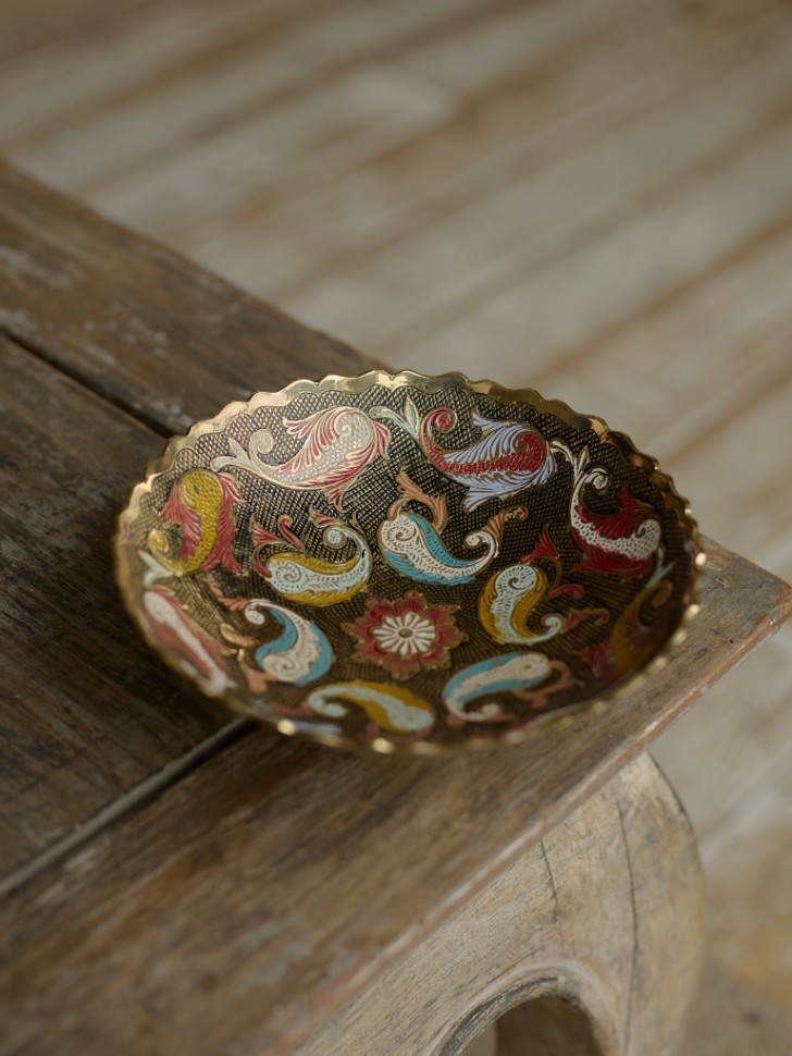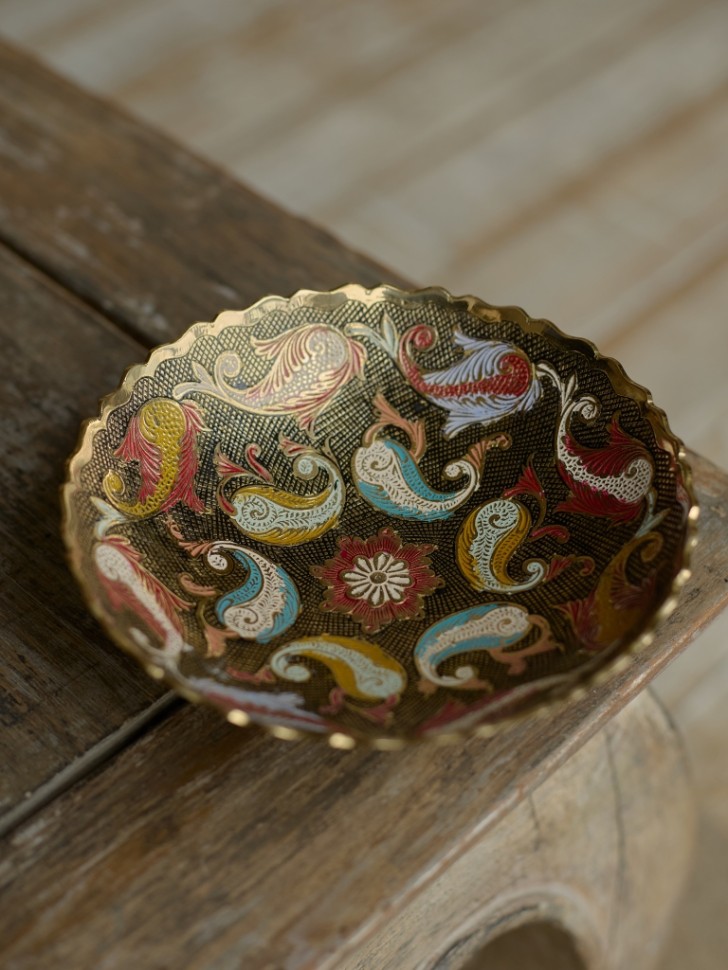 Конфетница из латуни для сервировки стола. Тёмная эмаль создаёт глубокий контраст с латунным узором. Подойдёт для интерьера в восточном, этническом или бохо стиле.