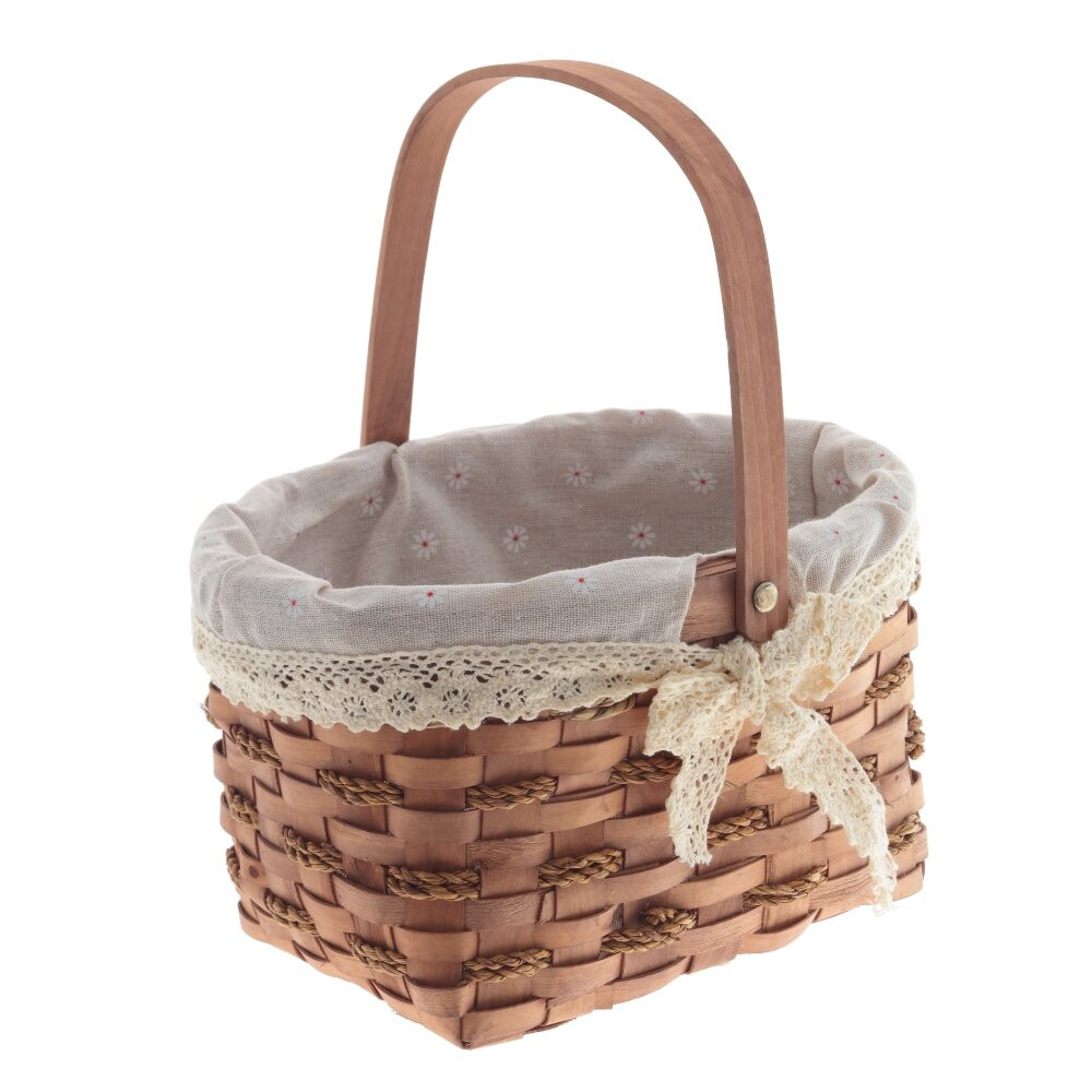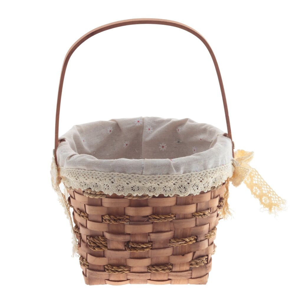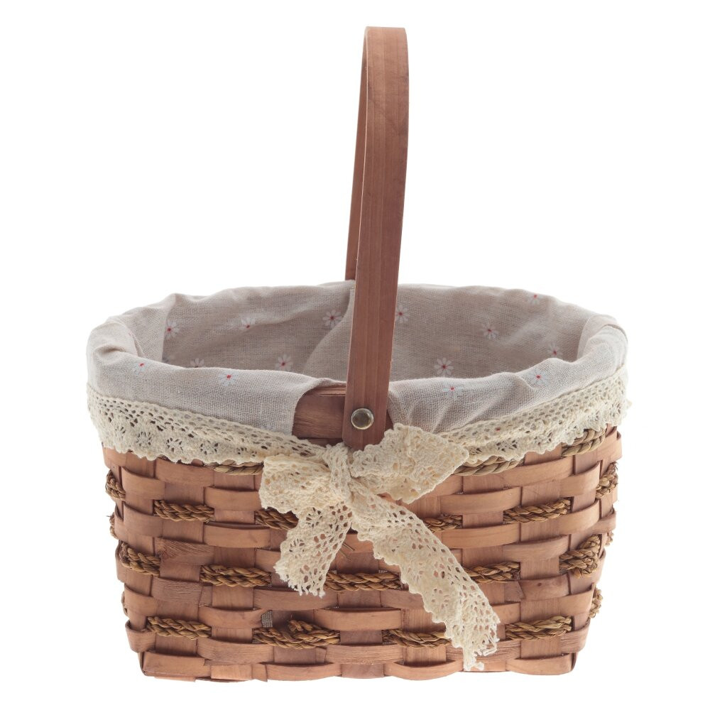 Очаровательная декоративная корзина с плотным плетением. Внутренняя часть оформлена текстильной вставкой из светлой ткани с мелким цветочным узором, что придаёт изделию уютный, деревенский шарм. Вставка украшена кружевной тесьмой и бантом. Удобная деревянная ручка надёжно закреплена прочными металлическими креплениями. Корзина подойдёт для хранения мелочей, косметики, рукодельных принадлежностей или оформления подарков и фотозон. Стильный и практичный аксессуар для дома, дачи или праздников.