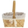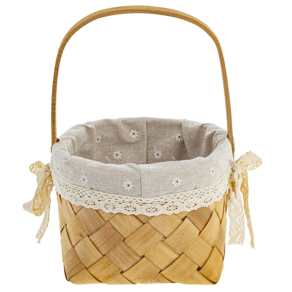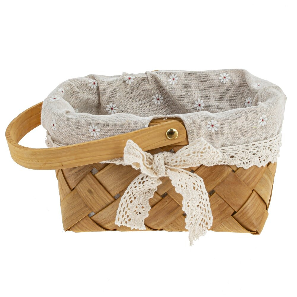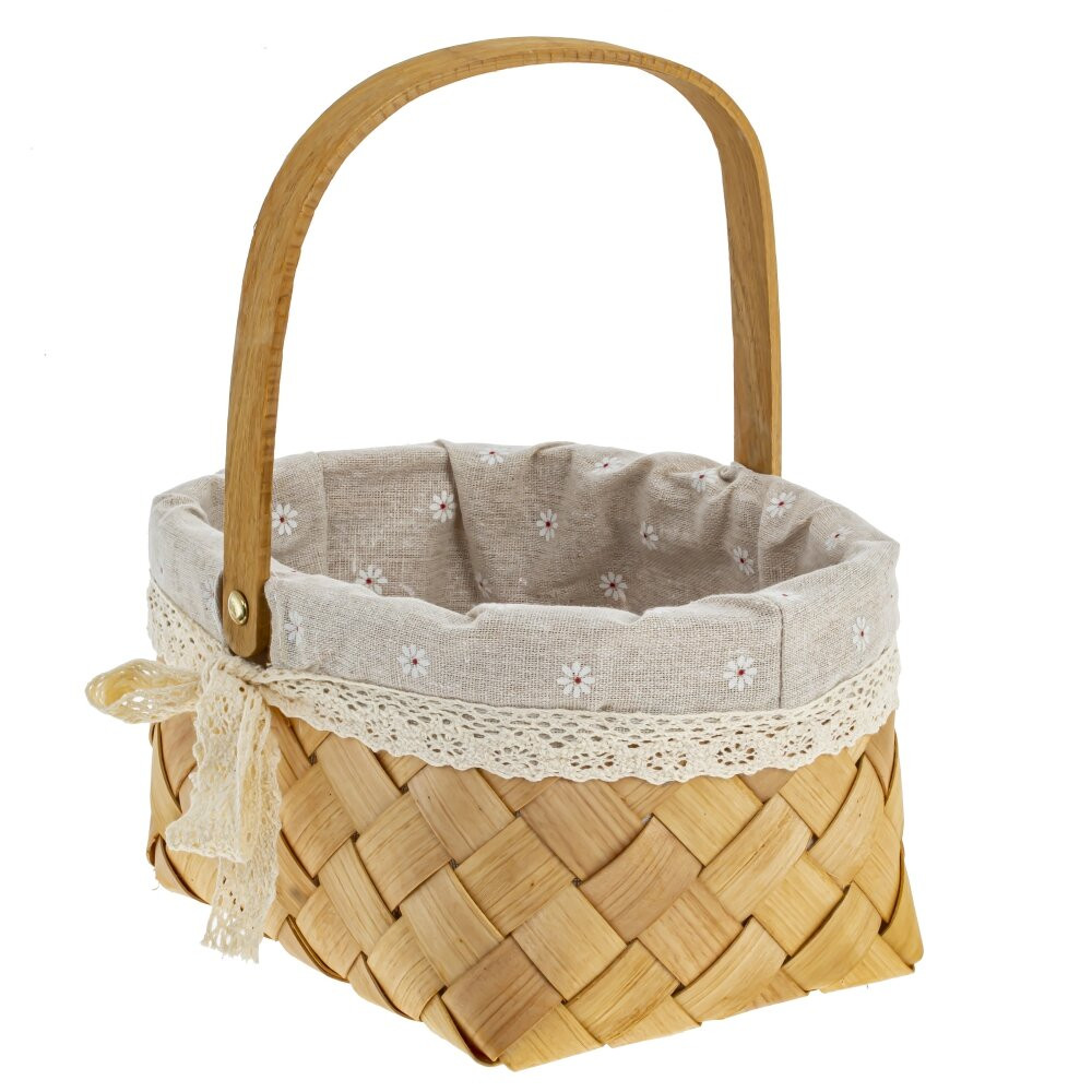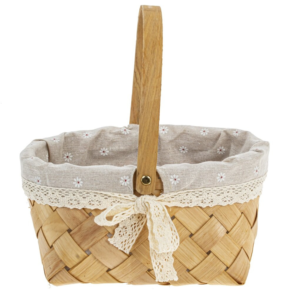 Очаровательная декоративная корзина с плотным плетением. Внутренняя часть оформлена текстильной вставкой из светлой ткани с мелким цветочным узором, что придаёт изделию уютный, деревенский шарм. Вставка украшена кружевной тесьмой и бантом. Удобная деревянная ручка надёжно закреплена прочными металлическими креплениями. Корзина подойдёт для хранения мелочей, косметики, рукодельных принадлежностей или оформления подарков и фотозон. Стильный и практичный аксессуар для дома, дачи или праздников.