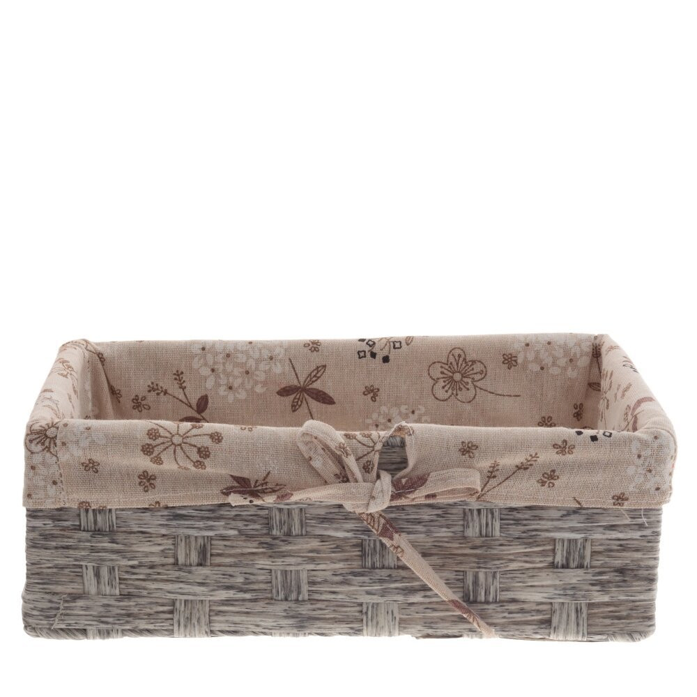Прямоугольная корзина, выполненная из полимерных материалов, что делает её прочной и долговечной. Основная часть корзины имитирует натуральное плетение, благодаря чему изделие смотрится стильно и аккуратно. Внутренняя часть корзины и её верхний край украшены съёмной текстильной вставкой светлого оттенка с изящным цветочным орнаментом. Тканевая отделка приятно контрастирует с "плетёной" фактурой пластика и придаёт корзине уютный, домашний вид. На передней стороне присутствует декоративный бантик из той же ткани, что подчёркивает аккуратность и эстетичность изделия. Такая корзина прекрасно подойдёт для хранения различных мелочей, текстиля, косметики или детских принадлежностей — она украсит любую комнату и внесёт в интерьер нотки уюта и порядка. Благодаря сочетанию полимерных материалов и текстиля, корзина проста в уходе и сохраняет привлекательный вид долгое время.