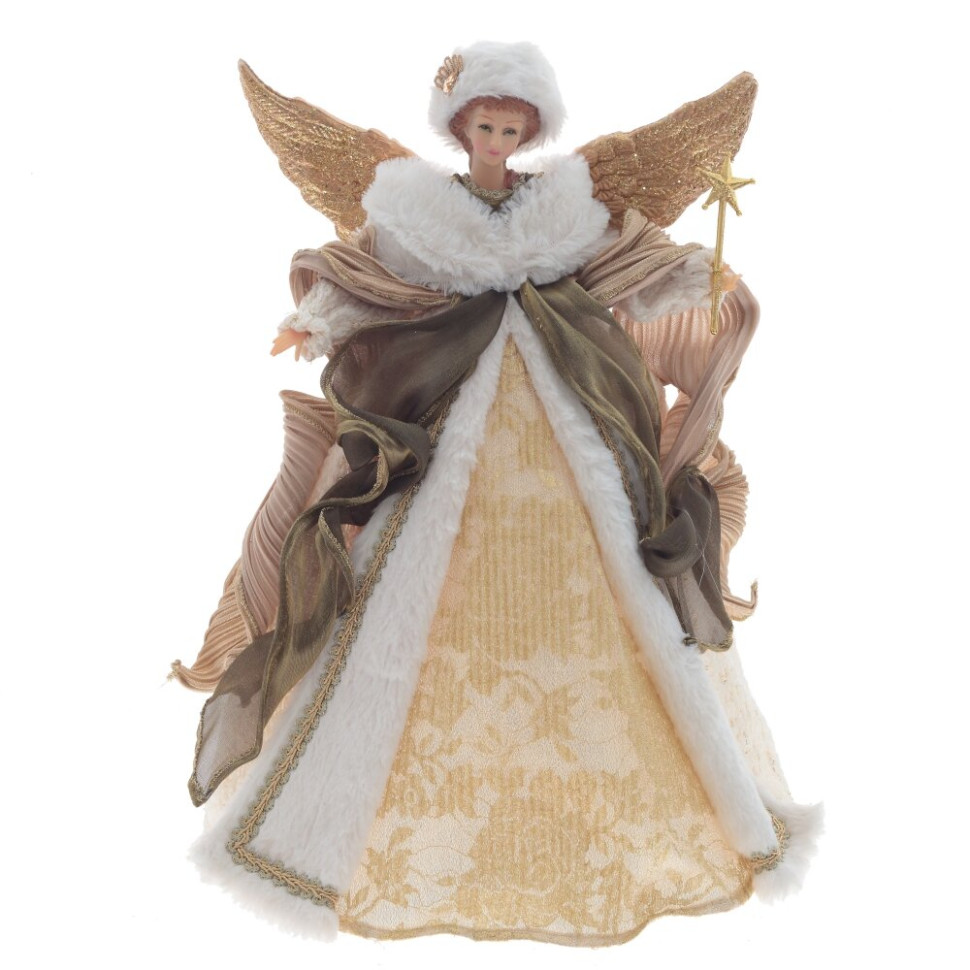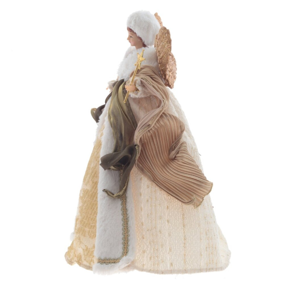 Голова и руки куклы, изготовленные из полимерных материалов, отличаются утонченностью и детализацией. Белая меховая шапка, украшенная золотой брошью, добавляет образу торжественности и изысканности. Роскошное золотое платье с отделкой из белого меха подчеркивает статус и великолепие ангела, а струящийся шелковый шарф придает ей особую изящность.