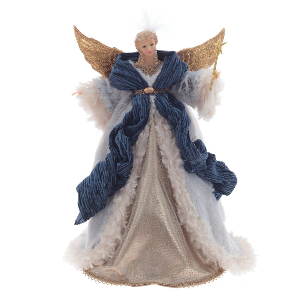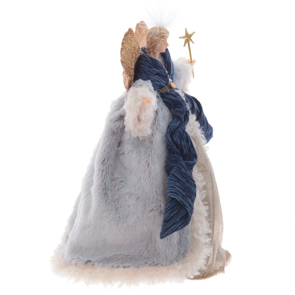 Голова и руки, изготовленные из полимерных материалов, поражают своей утонченностью и выразительностью. Прическа украшена нежным белым пухом,а шикарное голубое меховое платье дополнено золотым поясом и синей накидкой, придающей образу легкость и благородство. Нижняя часть куклы, сделанная из пластикового конуса, обеспечивает идеальную форму платью и стабильность фигурки.