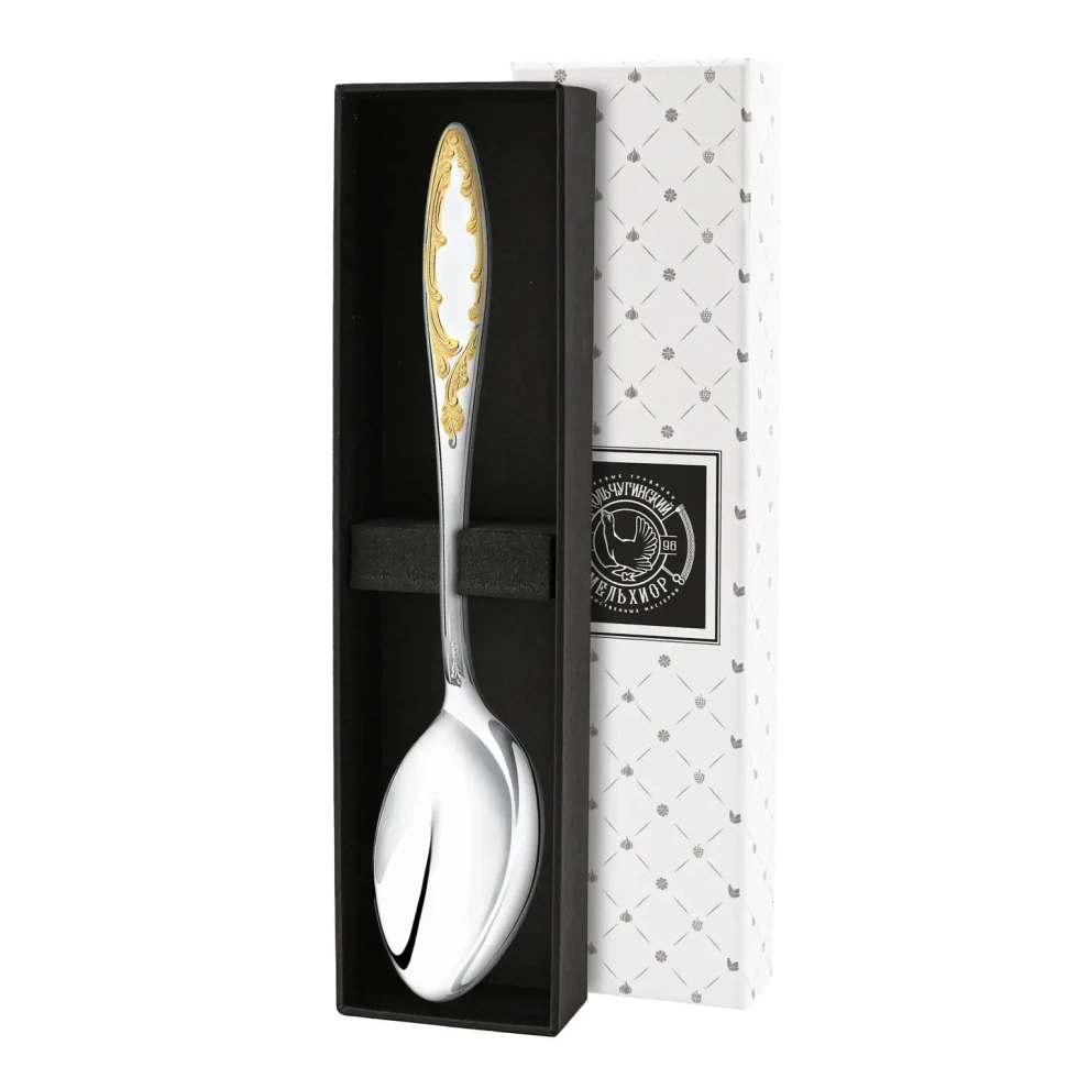 1. Ложка столовая "Пламя" посеребр. с позолоченным рисунком арт. С212308 - 1шт. (средний вес 1 х 63 гр. = 63 гр.) Длина: 194 мм. Ширина: 42 мм. Высота: 15 мм.
