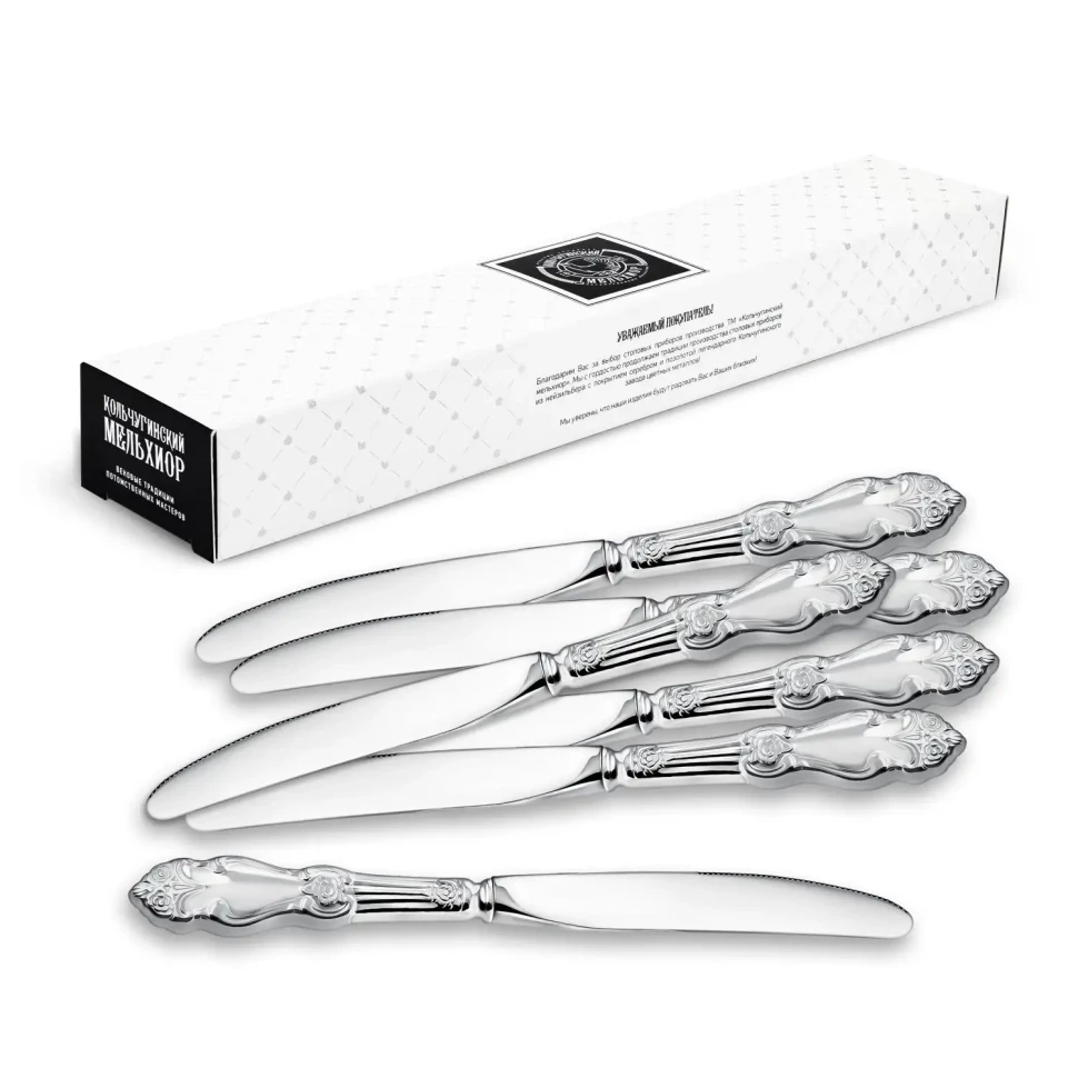 1. Нож десертный "Серебряная роза" посеребренный арт. С34408/1 - 6шт. (средний вес 6 х 94 гр. = 564 гр.) Длина: 220 мм. Ширина: 22 мм. Высота: 10 мм.