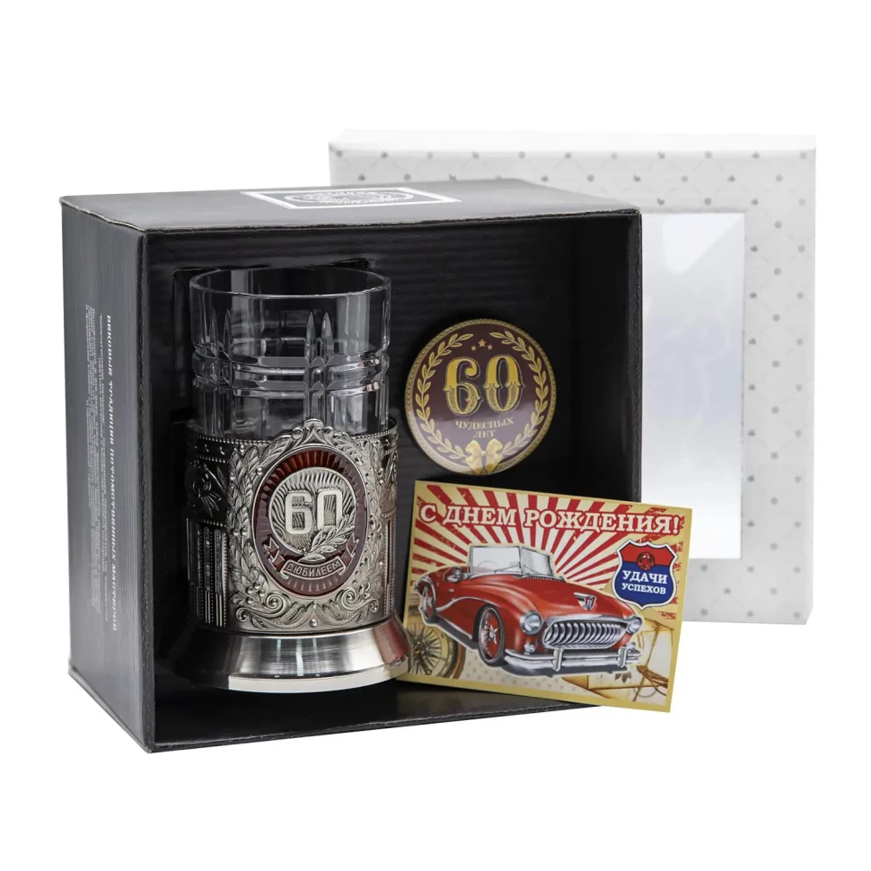 Набор для чая "60 лет Советский" никелированный с чернением и с эмалью с открыткой и значком