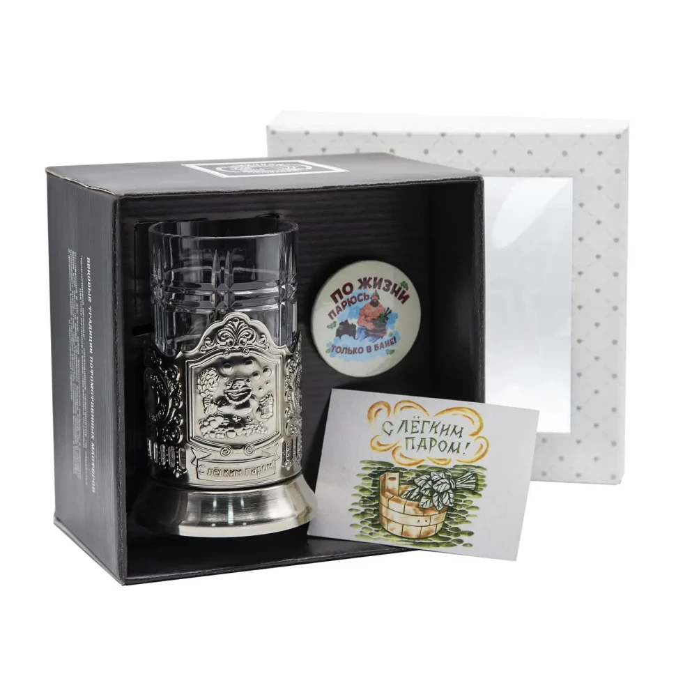 Набор для чая "Банный" никелированный с чернением с открыткой и значком "С легким паром"