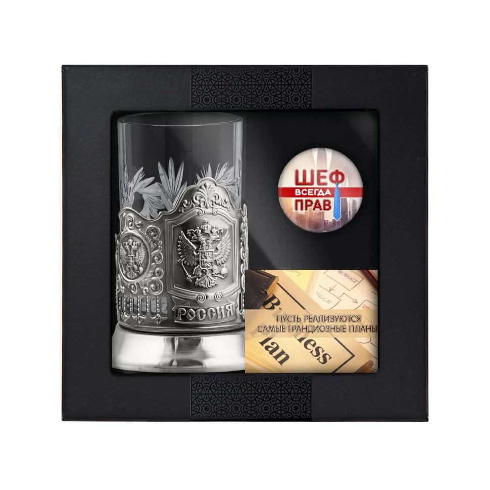 Набор для чая "Герб РФ" никелированный с чернением с открыткой и значком "Руководителю"