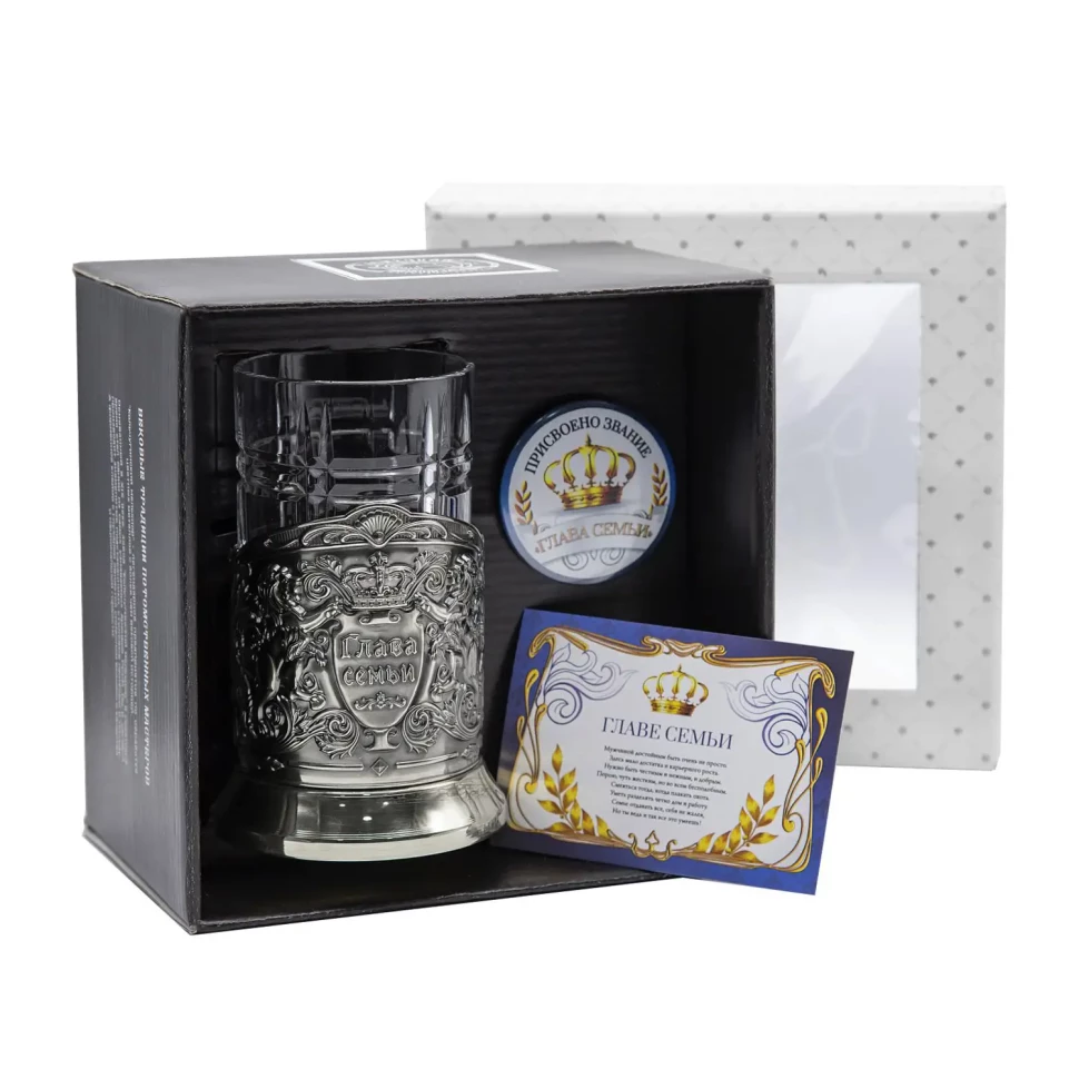 Набор для чая "Глава семьи" никелированный с чернением с открыткой и значком "Глава семьи"
