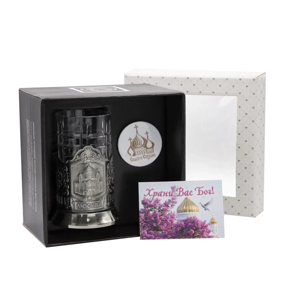Набор для чая "Храм Христа Спасителя" никелированный с чернением с открыткой и значком "Спаси и сохрани"
