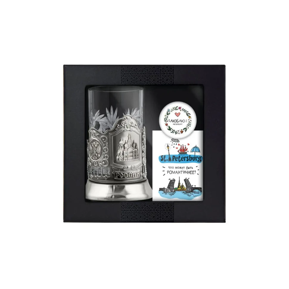 Набор для чая "Храм Спаса-на-Крови" никелированный с чернением с открыткой и значком "Санкт Петербург"