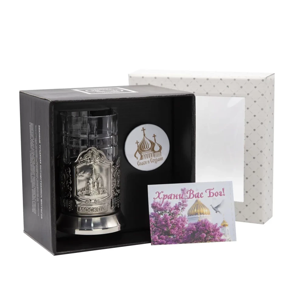 Набор для чая "Храм Василия Блаженного" никелированный с чернением с открыткой и значком "Спаси и сохрани"