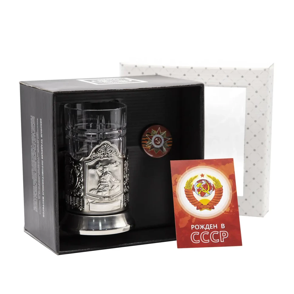 Набор для чая "Комбат" никелированный с чернением с открыткой и значком