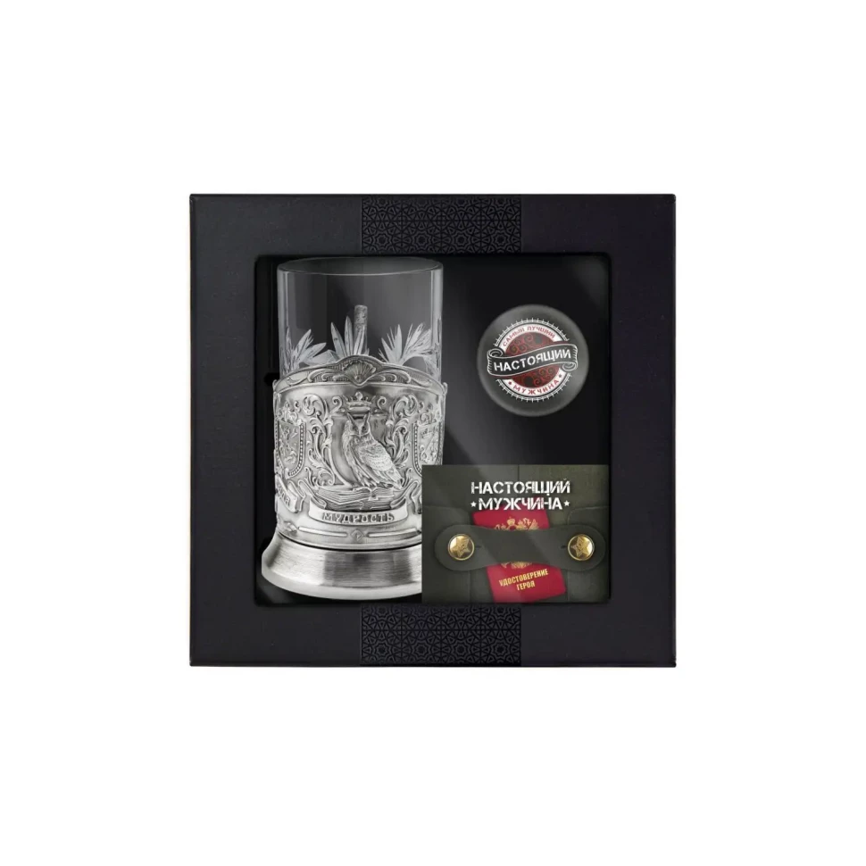 Набор для чая "Мудрый руководитель" никелированный с чернением с открыткой и значком "Настоящий муж
