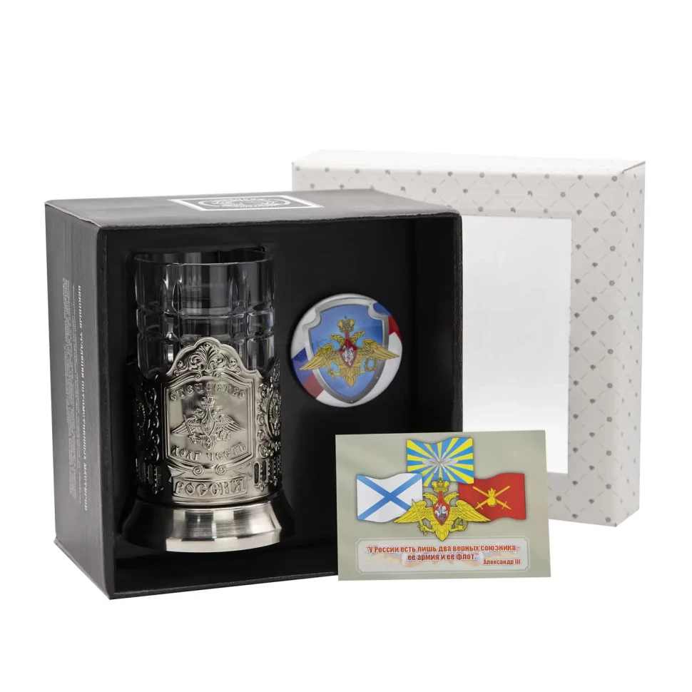 Набор для чая "Отечество Долг Честь" никелированный с чернением с открыткой и значком "Вооруженные силы"