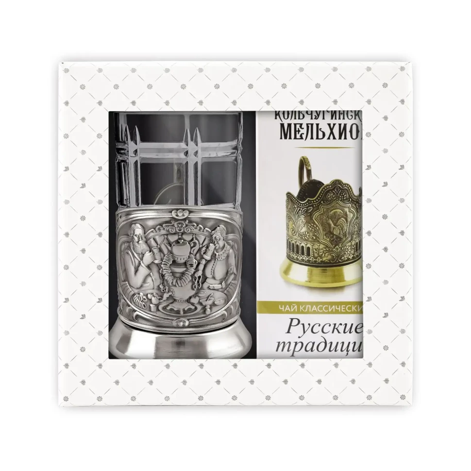 Набор для чая "Русское чаепитие (новая пластина)" никелированный с чернением с чаем