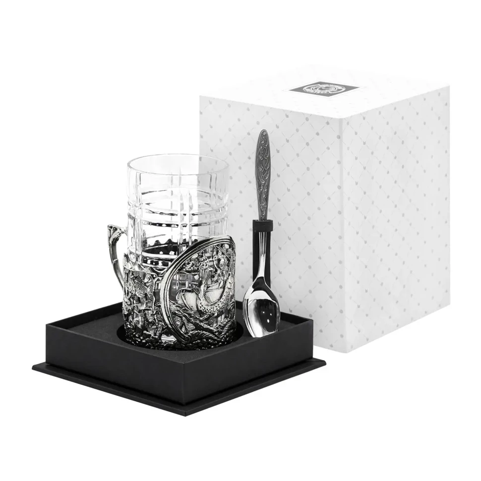 Набор для чая "Рыбацкий": ложка, стакан, подстаканник посеребренный с чернением