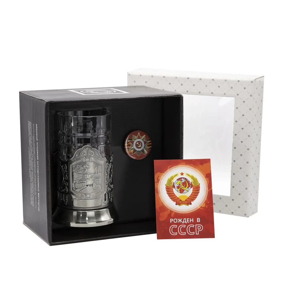 Набор для чая "Танк Т-34" никелированный с чернением с открыткой и значком