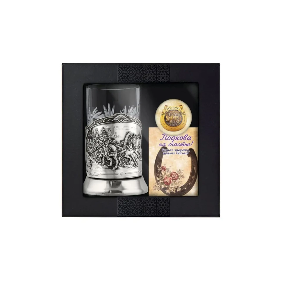Набор для чая "Тройка" (Триумфальная) никелированный с чернением с открыткой и значком "На удачу"