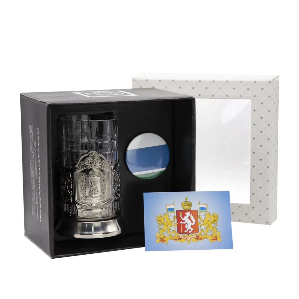 Набор для чая "Урал" никелированный с чернением с открыткой и значком "Урал Герб"