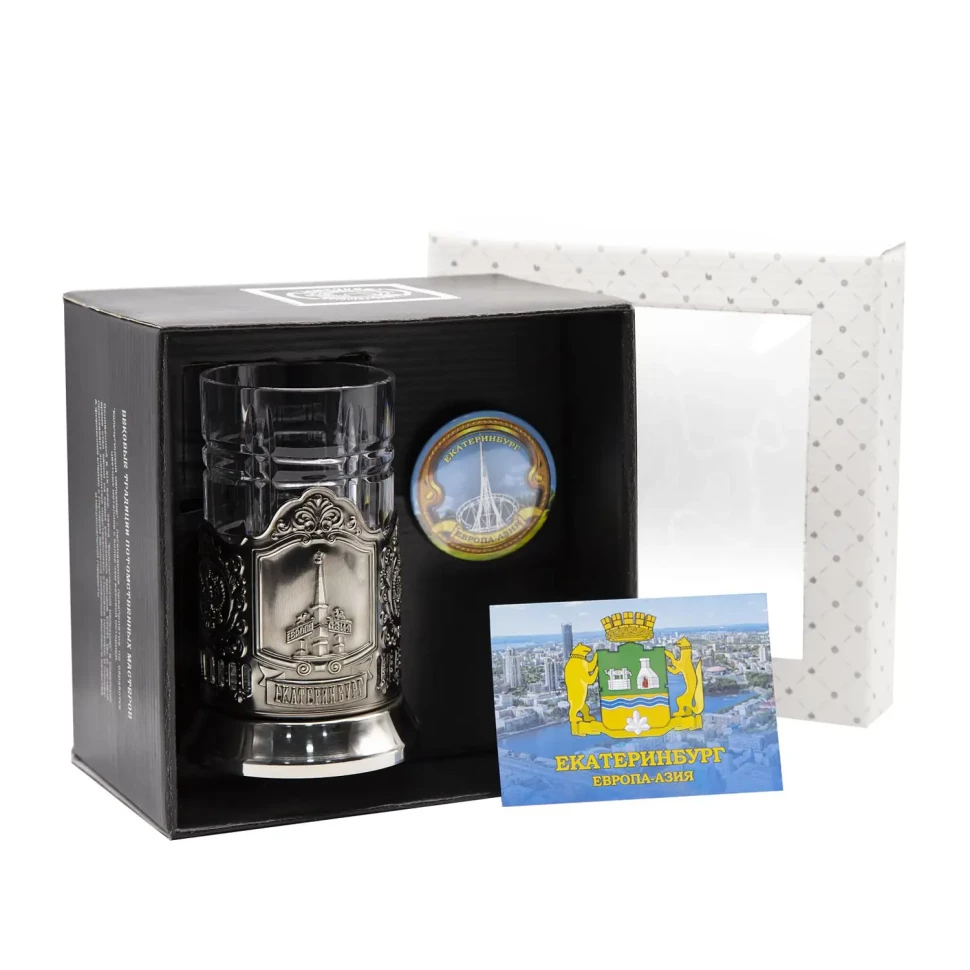 Набор для чая "Екатеринбург" никелированный с чернением с открыткой и значком "Екатеринбург Европа-Азия"