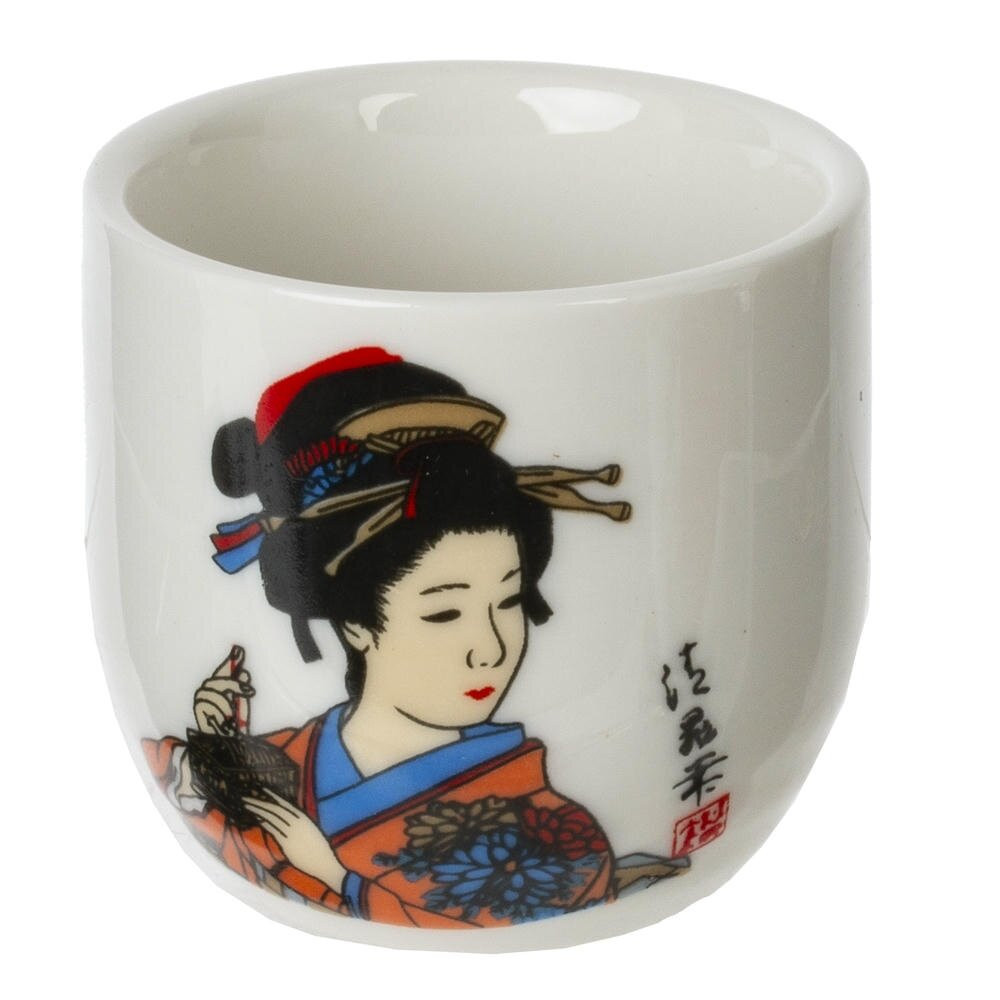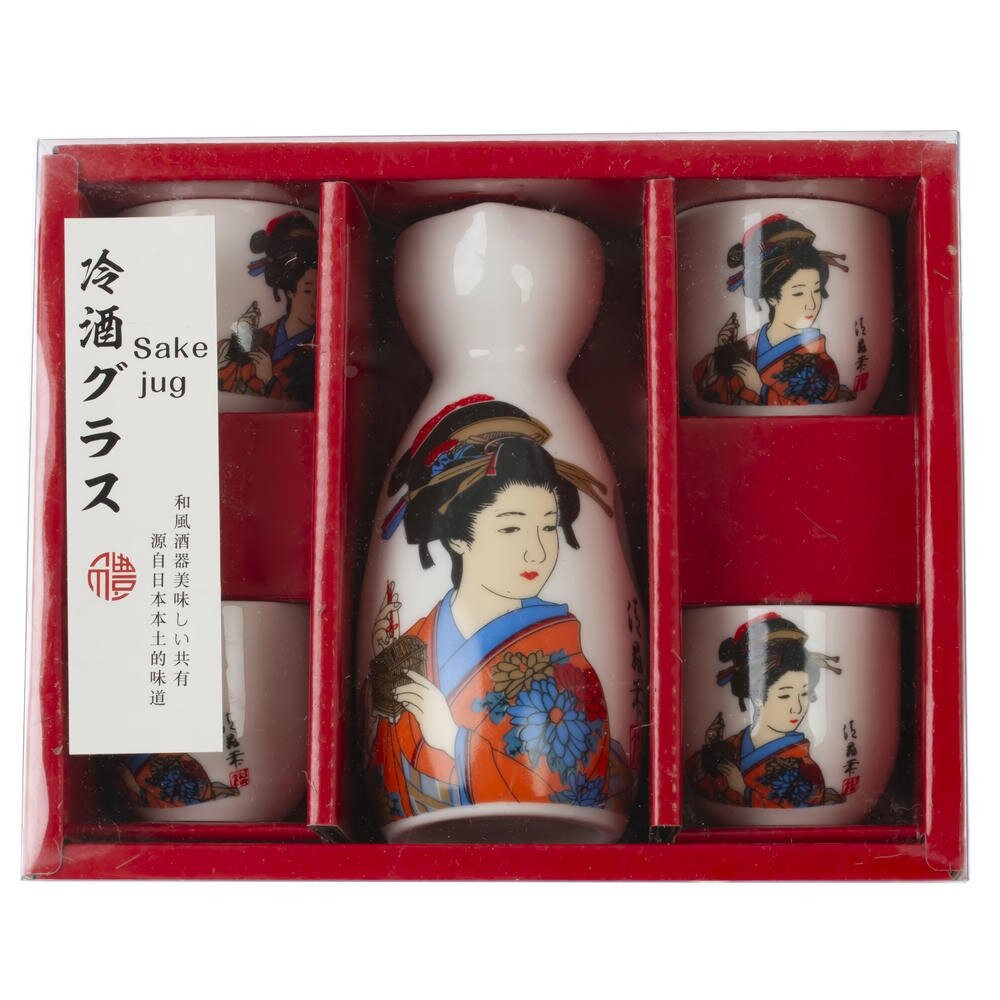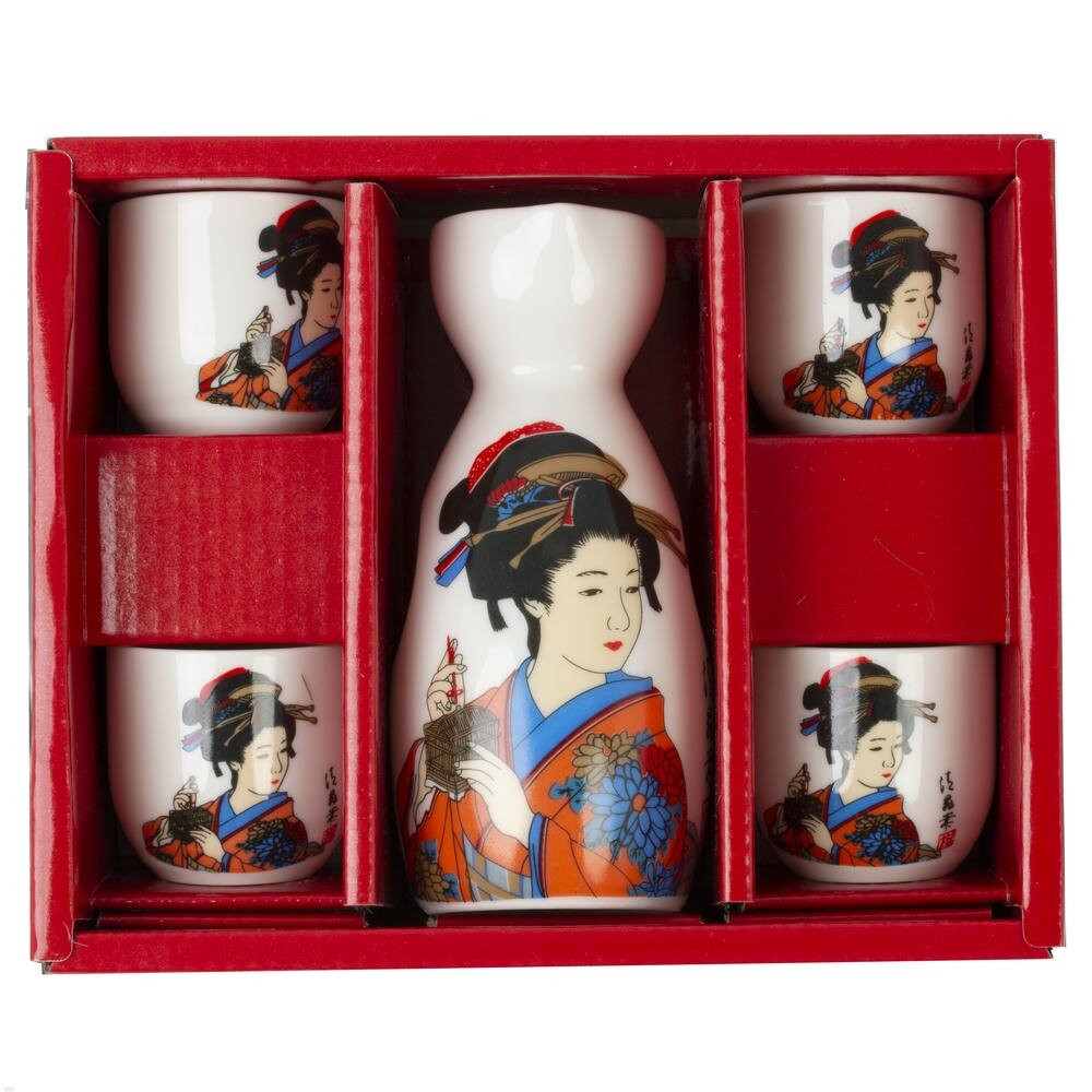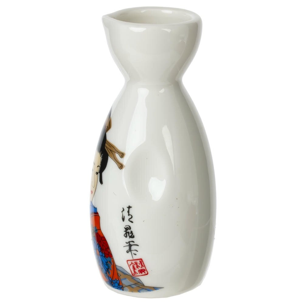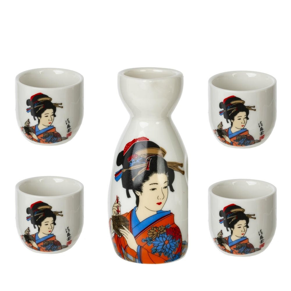 Элегантный набор для саке из качественного фарфора: графин объемом 140 мл и четыре стакана по 35 мл каждый. Белоснежная поверхность покрыта гладкой глазурью и украшена ярким традиционным рисунком в японском стиле с изящной женщиной в кимоно, цветами и каллиграфическими символами. Графин с удобным узким горлышком и устойчивым основанием сохраняет температуру напитка, а округлые чашечки приятно лежат в руке. Комплект создаст атмосферу японской чайной, подойдет для подачи теплого или холодного саке, станет красивым акцентом на столе и удачным подарком ценителям восточной эстетики. Компактный, практичный и эффектный набор для домашних ужинов и тематических встреч.