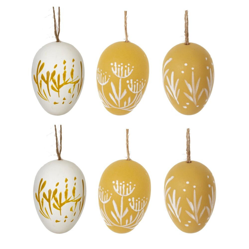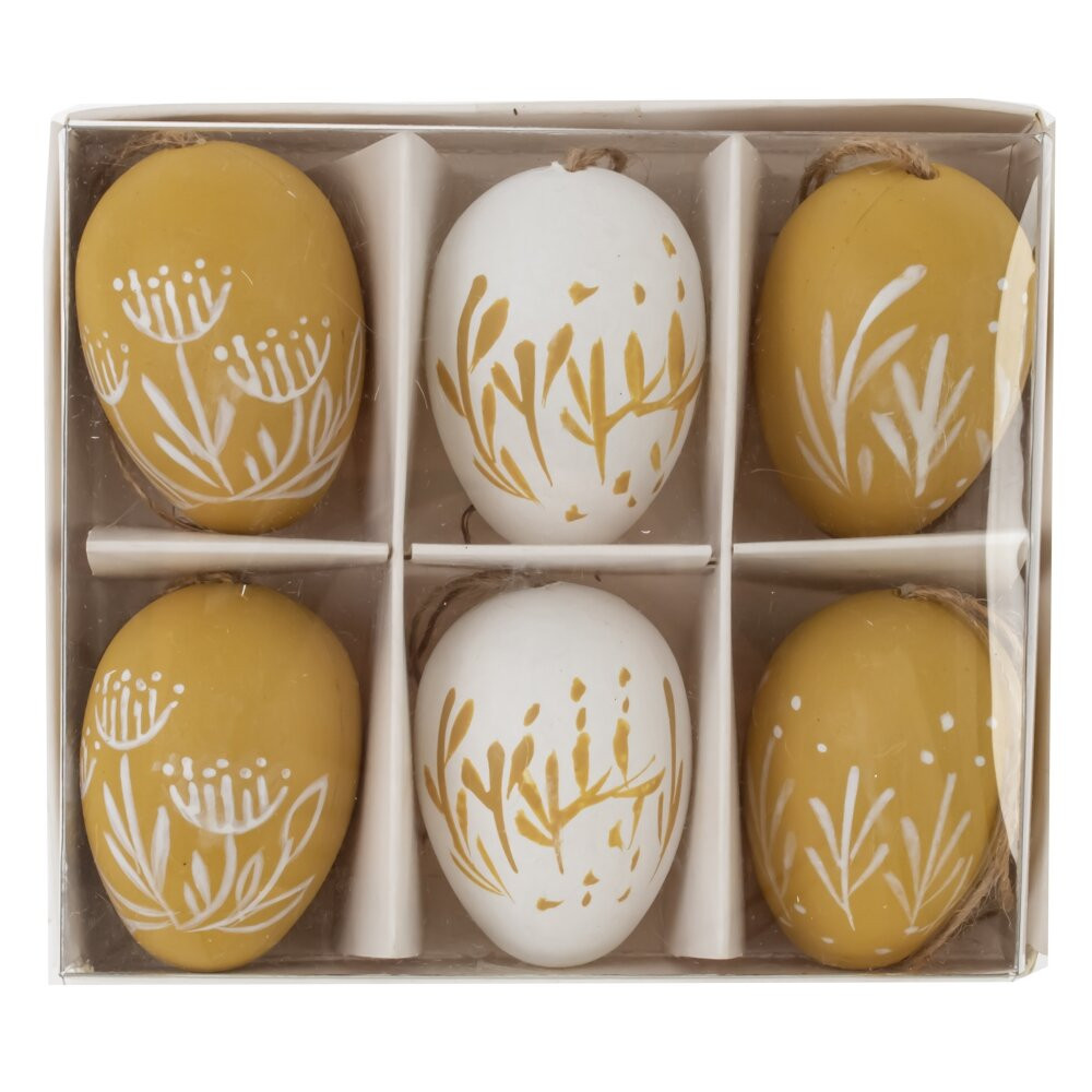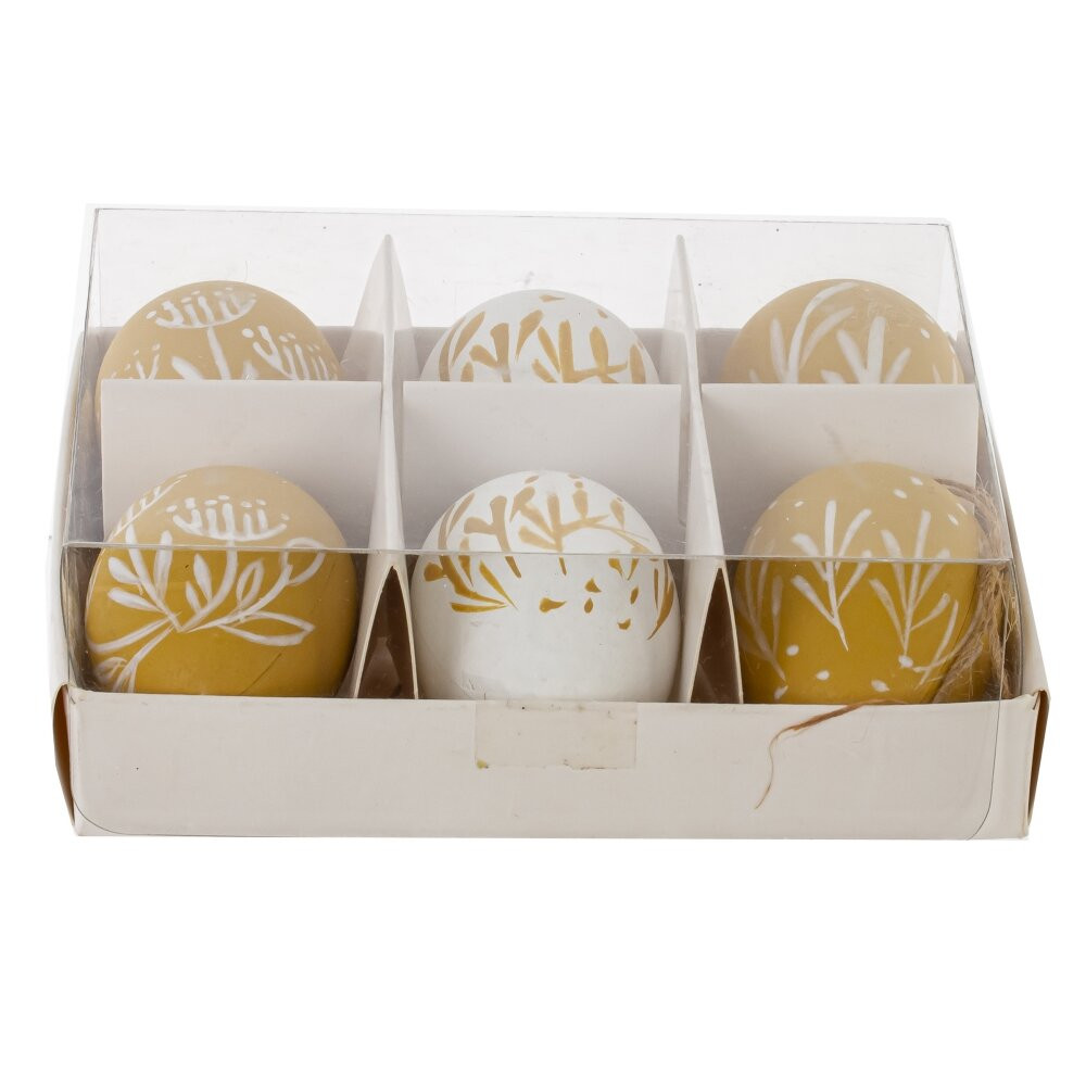 Этот набор из 6 декоративных подвесных яиц—прекрасный элемент декора для любого интерьера. Изделия выполнены из полимерных материалов и имеют размер 3,5*5,5 см. Они оформлены в нежных пастельных тонах: белом и зеленом, с изящными рисунками в виде растительных мотивов. Благодаря стильному дизайну и натуральным оттенкам, эти подвески подойдут для украшения дома к Пасхе, зимним праздникам или просто для создания уютной атмосферы. Каждое яйцо снабжено веревочной петлей, что облегчает их развешивание на ветках, венках или других декоративных элементах.