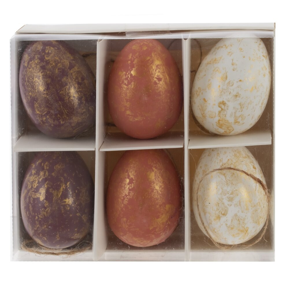 Набор из 6 декоративных подвесных яиц к Пасхе – стильное украшение для дома и праздничной сервировки. В комплект входят яйца трёх расцветок: белые с золотыми «мраморными» разводами, благородного сливового оттенка с золотым напылением и тёплого терракотового тона. Каждое изделие выполнено из лёгких полимерных материалов и дополнено прочной петелькой из шпагата для удобного подвешивания. Декор отлично подойдёт для пасхального дерева, оформления веточек, корзин, венков, подарочных композиций и фотозон. Такие яйца создадут уютную атмосферу праздника и гармонично впишутся как в классический, так и в современный интерьер.