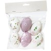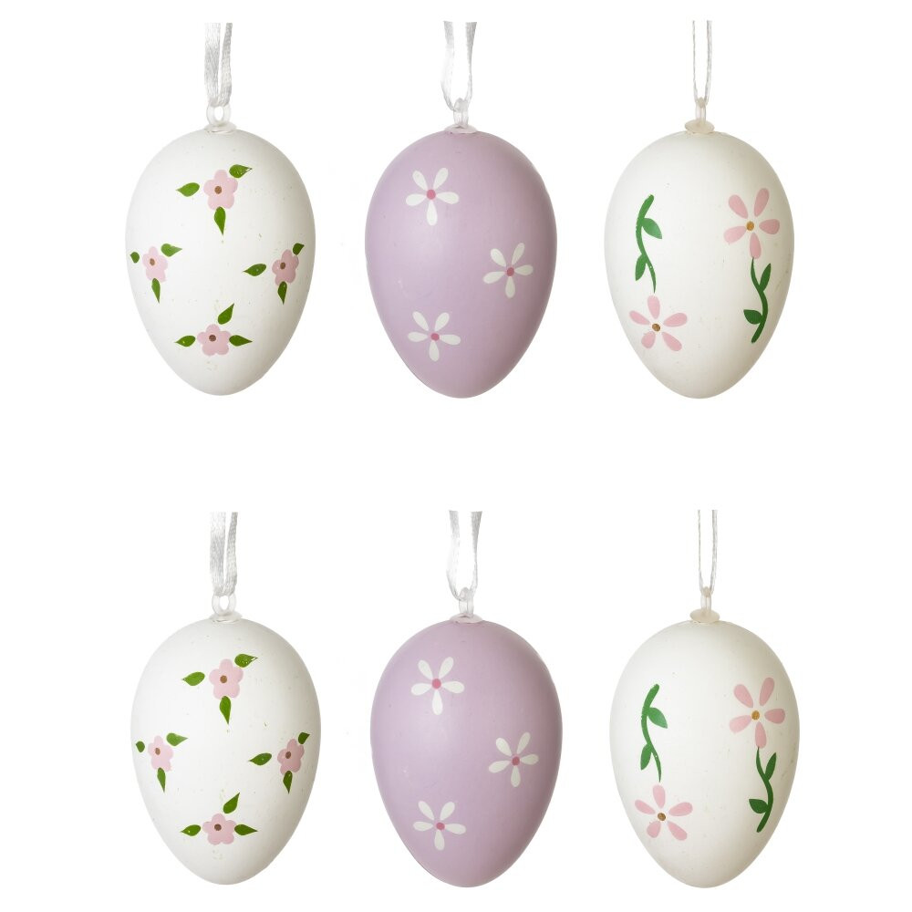 Нежный пасхальный набор из 6 подвесных декоративных яиц станет изюминкой весеннего декора вашего дома. В комплект входят яйца размером 4*6 см из полимерных материалов, легкие и безопасные в использовании. Поверхность украшена аккуратными цветочными орнаментами в пастельных тонах: сочетание белого и лавандового оттенков с розовыми цветами и зелеными листочками создаёт атмосферу уюта и праздника. Каждое яйцо снабжено тонкой белой атласной ленточкой для удобного подвешивания. Идеально подходят для оформления пасхального дерева, композиции из веточек, украшения стола, корзинок с угощениями или подарочных наборов.