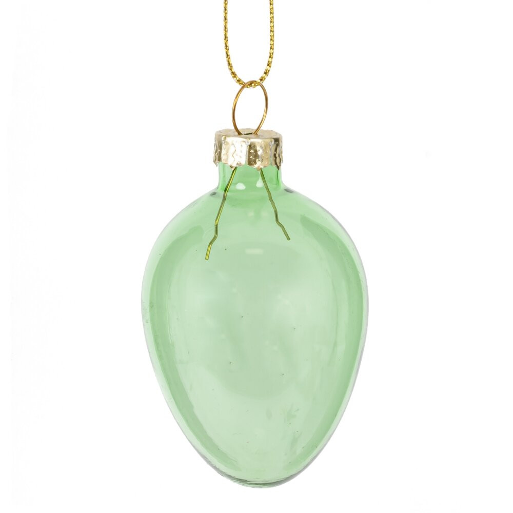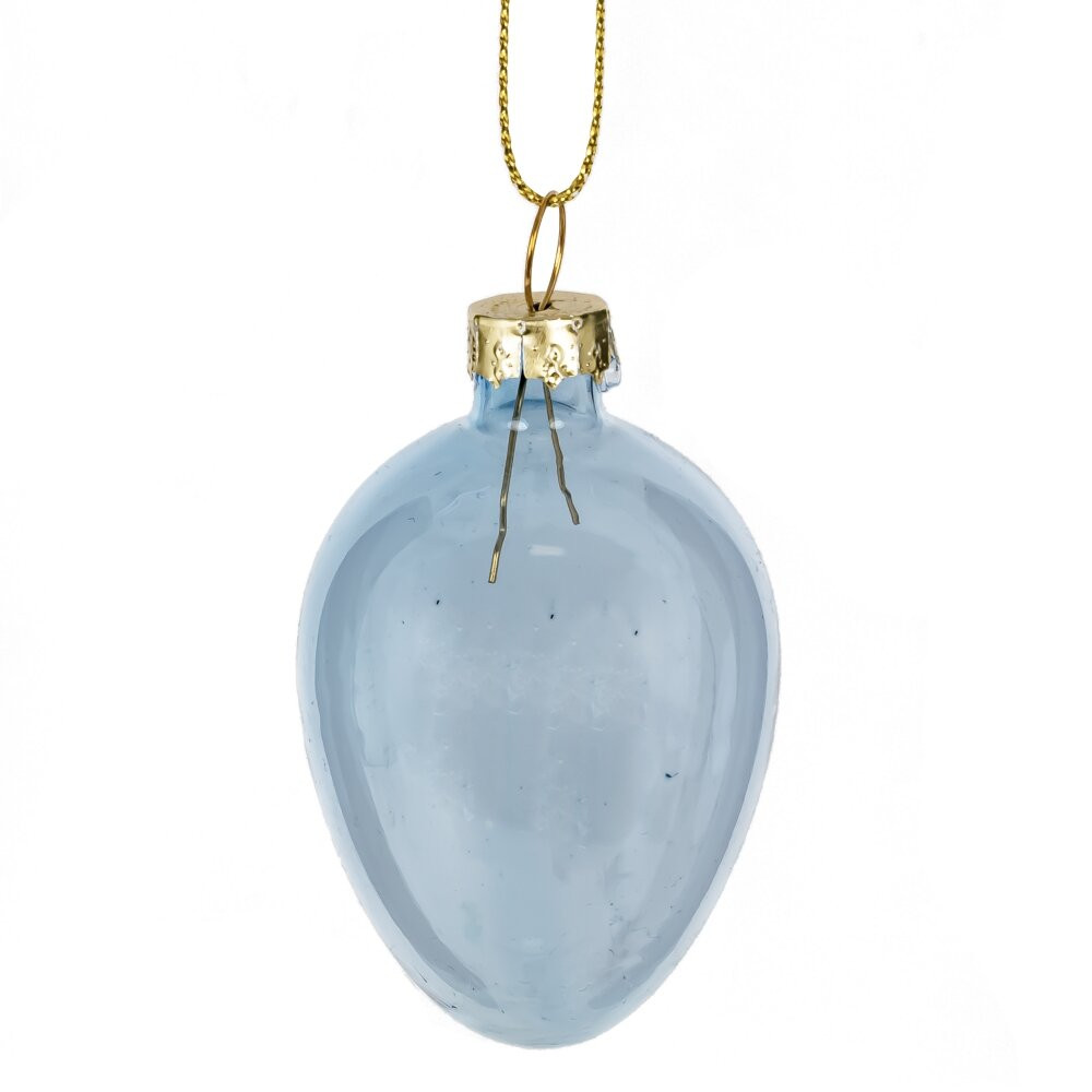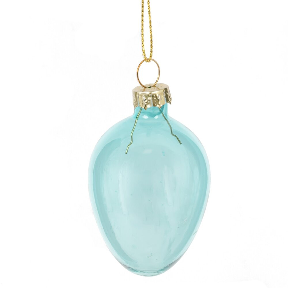 Набор из 6-ти декоративных подвесных украшений "Яйцо пасхальное" выполнен из стекла и станет прекрасным дополнением к праздничному интерьеру. Каждый элемент имеет изящную форму яйца размером 4 x 5,5 см, что делает их идеальными для украшения пасхального дерева, венков, комнатных растений или других декоративных композиций. Прозрачные стеклянные изделия выполнены в нежных пастельных оттенках голубого и зелёного цвета, что придаёт им элегантный и воздушный вид. Золотистая металлическая крепёжная часть и тонкая петелька позволят легко подвешивать яйца на любую основу. Подобный декор прекрасно впишется в праздничную атмосферу, добавляя изысканности, света и весеннего настроения. Такой комплект станет отличным выбором для украшения дома, создания уютной композиции или оригинального подарка к Пасхе.