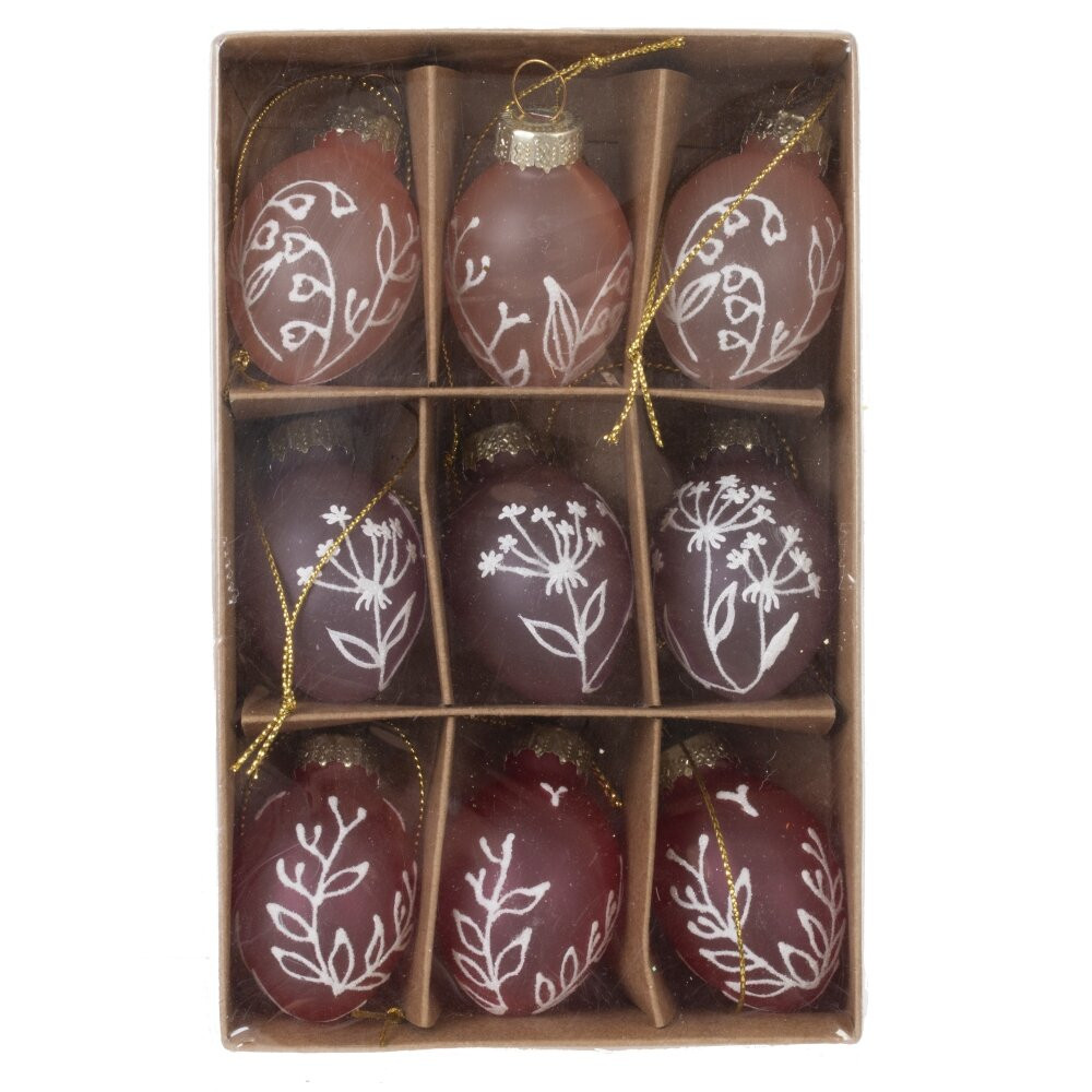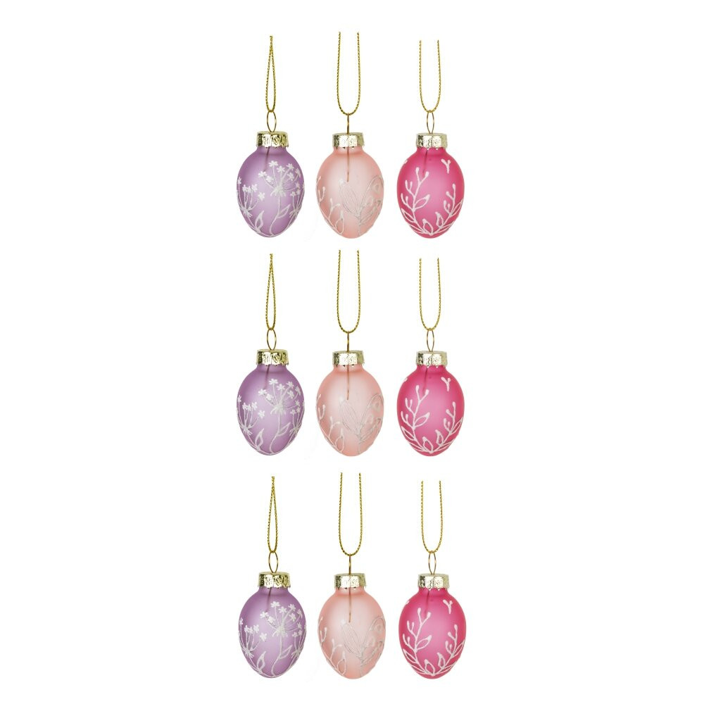 Набор из 9-ти декоративных подвесных изделий «Яйцо пасхальное» станет изящным украшением к светлому празднику Пасхи. Стеклянные яйца нежных розовых и сиреневых оттенков оформлены тонким белым растительным орнаментом, придающим композиции легкость и праздничность. Каждое яйцо оснащено золотистой подвесной нитью и металлической декоративной коронкой, что позволяет легко разместить их на пасхальном деревце, веточках, окне, люстре или в настольной композиции. Набор гармонично сочетается с текстильным и бумажным декором, подходит для оформления дома, кафе, витрин и создания уютной атмосферы весеннего торжества. Стекло не тускнеет со временем, изделия можно использовать многократно из года в год.
