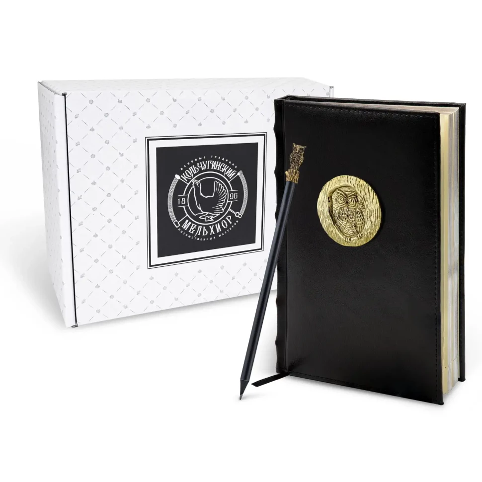Набор канцелярский (ежедневник+карандаш) "Сова круглая" латунный из экокожи