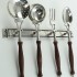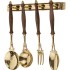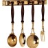 Набор из четырех латунных кухонных принадлежностей с деревянными ручками. В набор входят настенный держатель, ложка, вилка, половник и шумовка. Длина приборов: 35см, 33см и 31см.